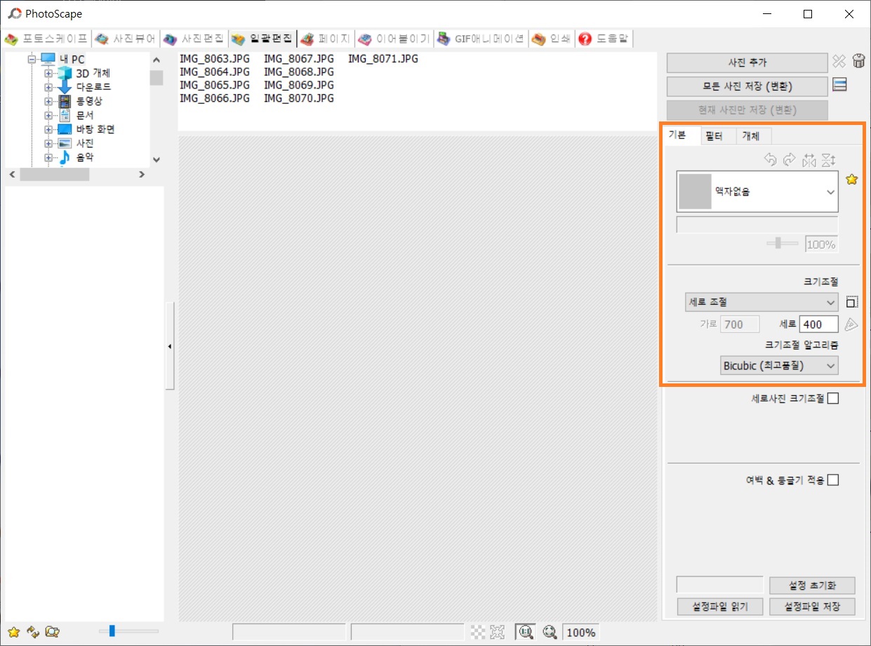 일괄편집에서는 사진들의 크기를
