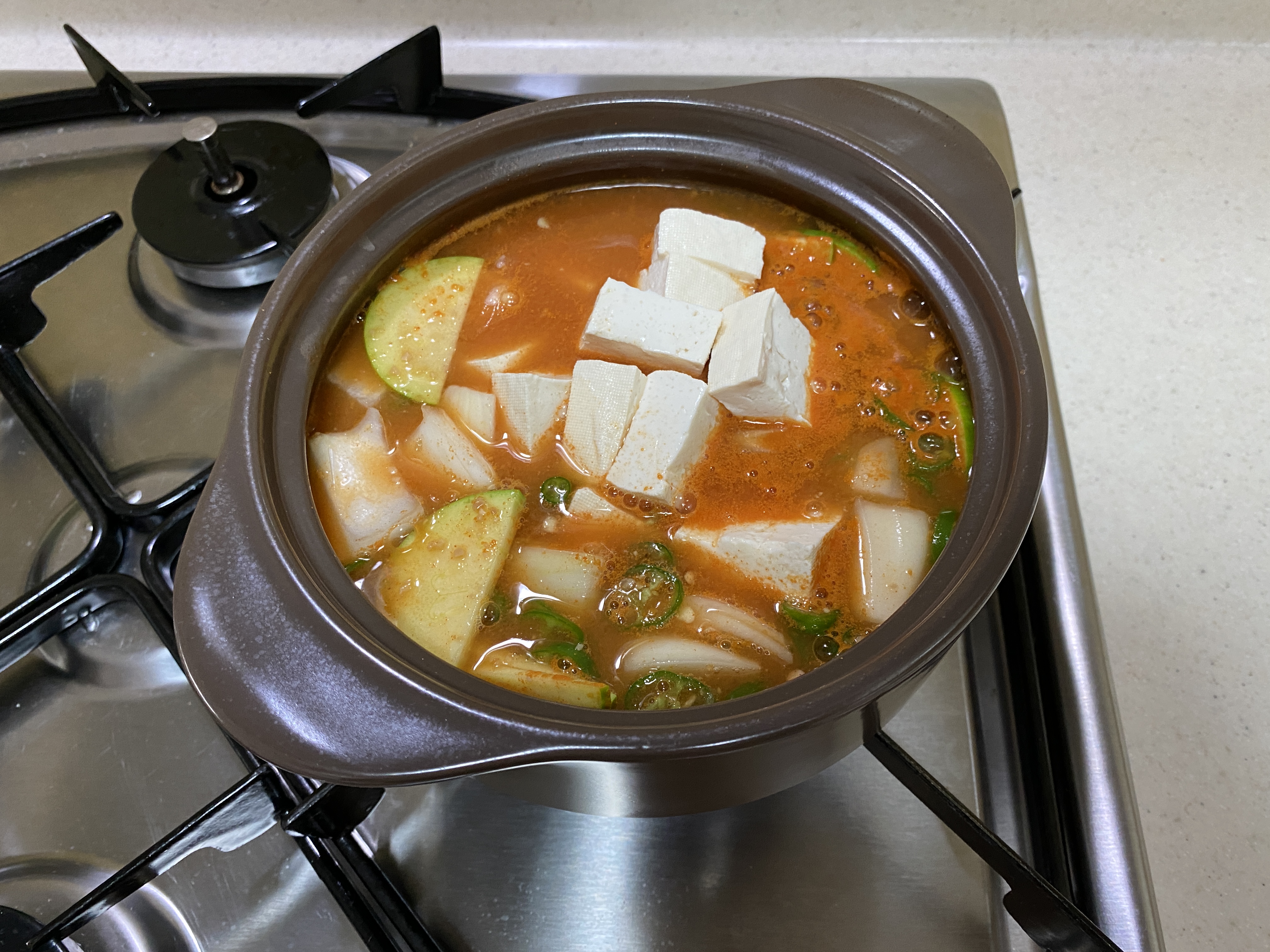 두부 1/2모, 애호박 1/5개, 청양고추 2개, 양파 1/2개,