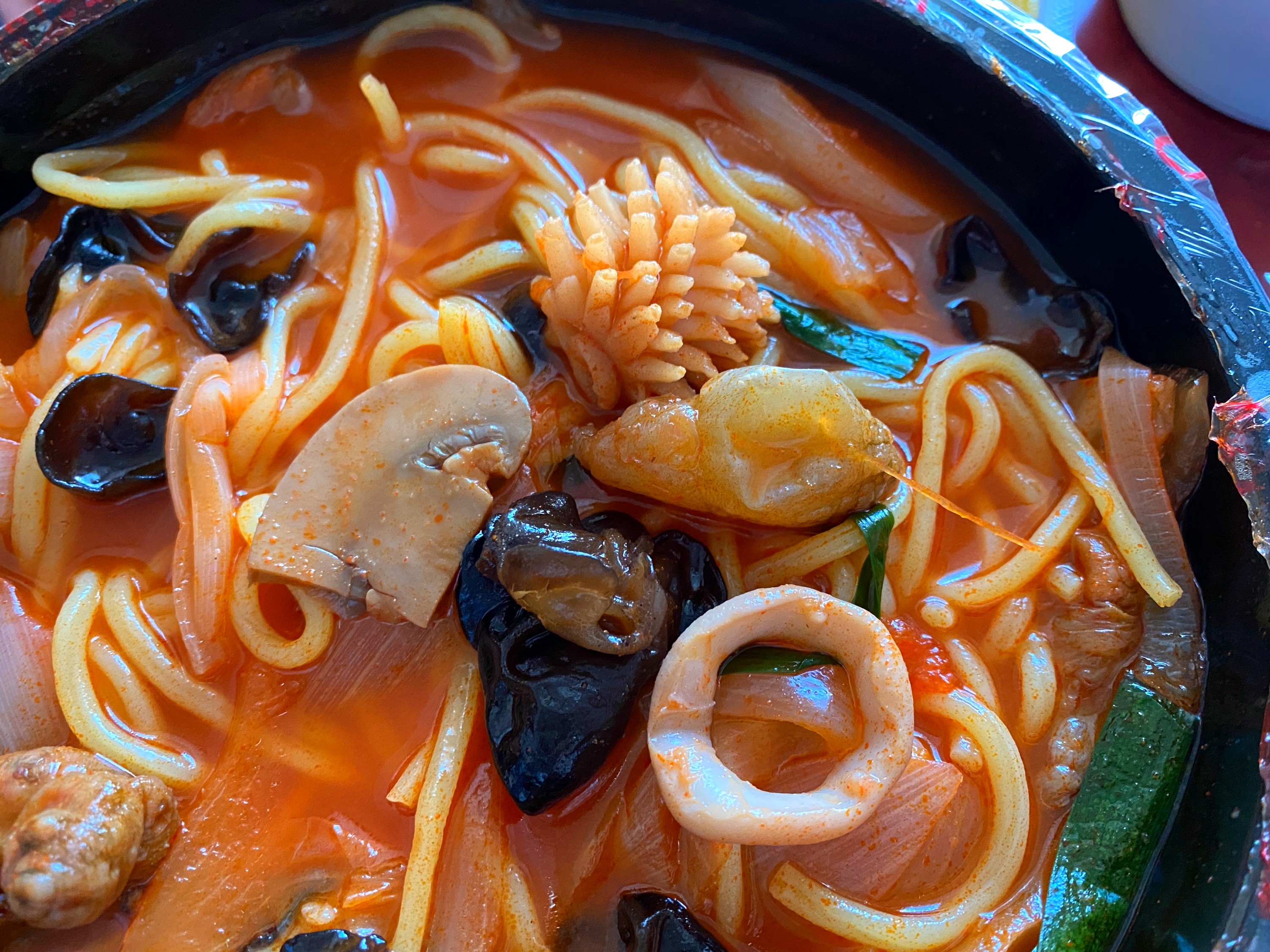 홍합, 미더덕, 배추, 양파가 많이 들어있고