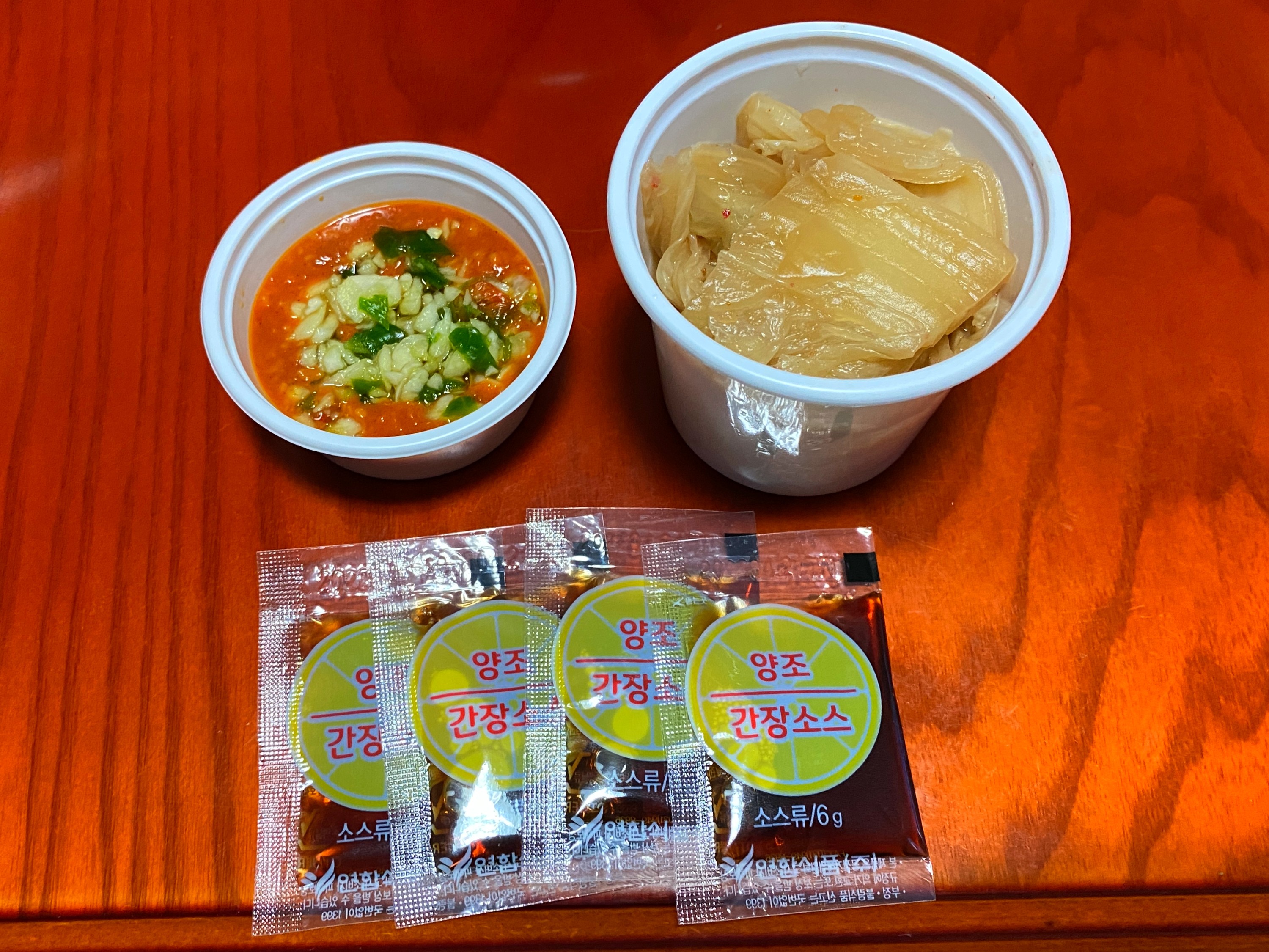 밑반찬으로는 쌈장, 묵은지, 간장이 있고