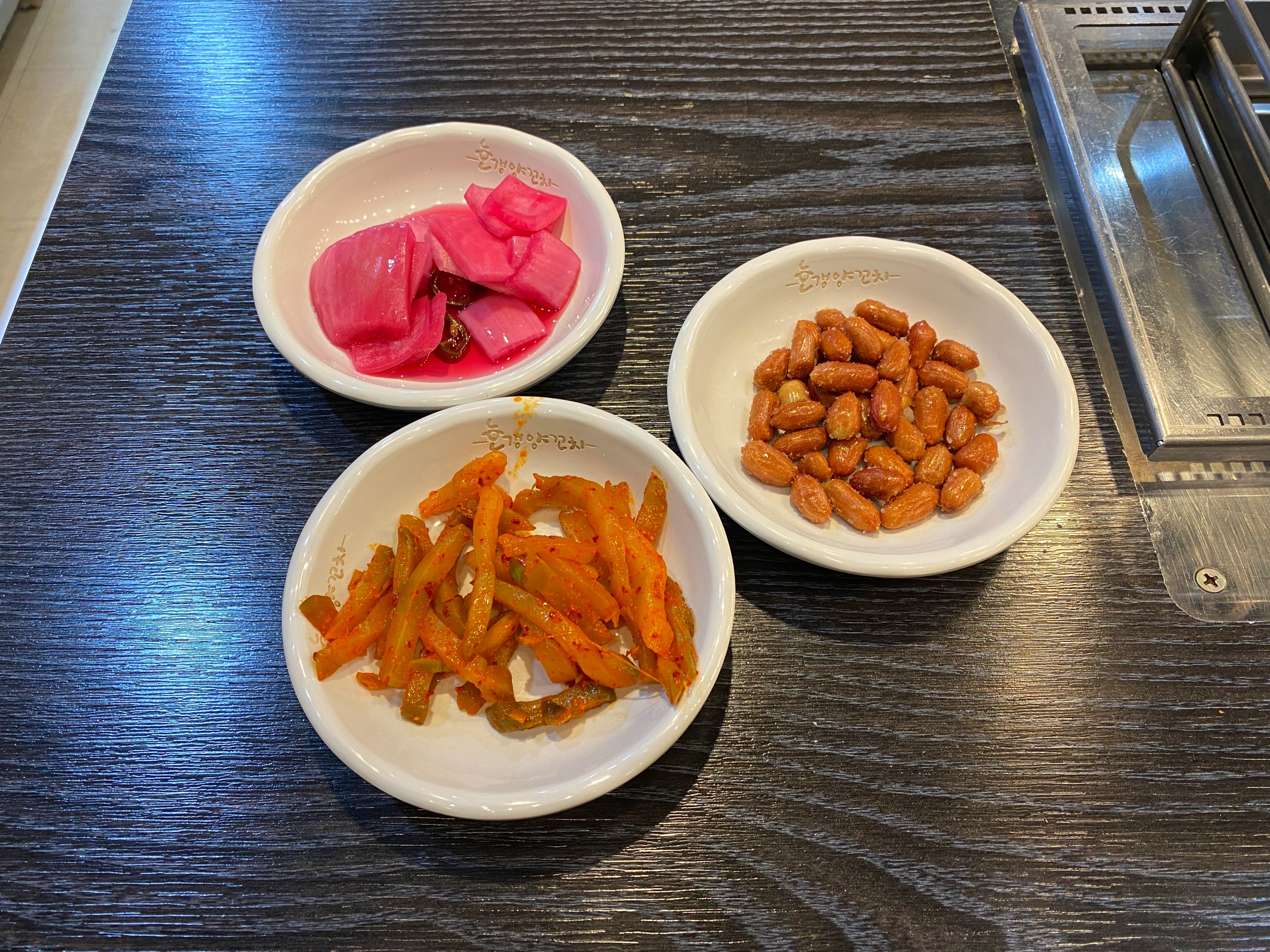 기본찬으로는 양파장아찌, 땅콩볶음, 짜차이가 나온다.