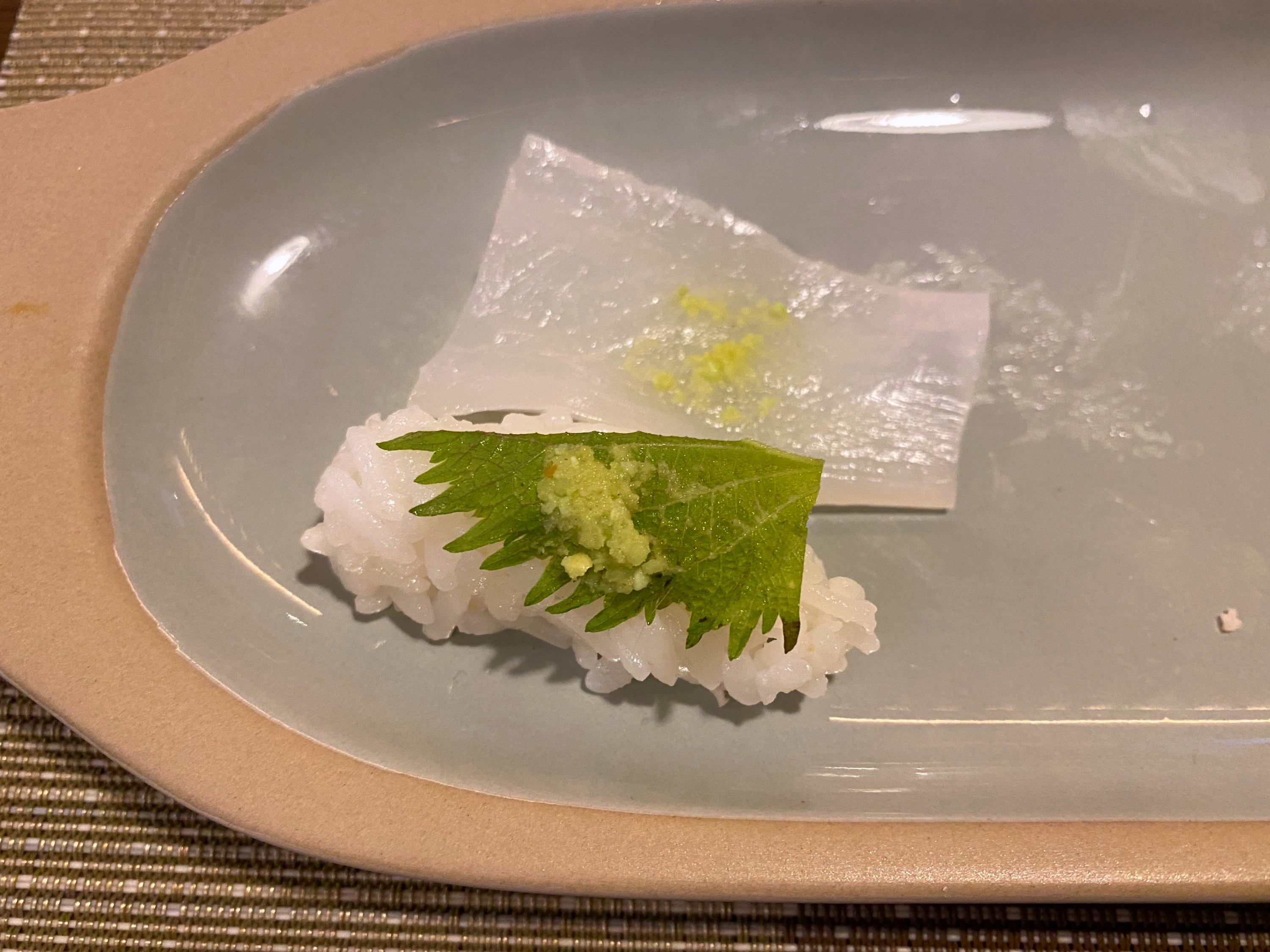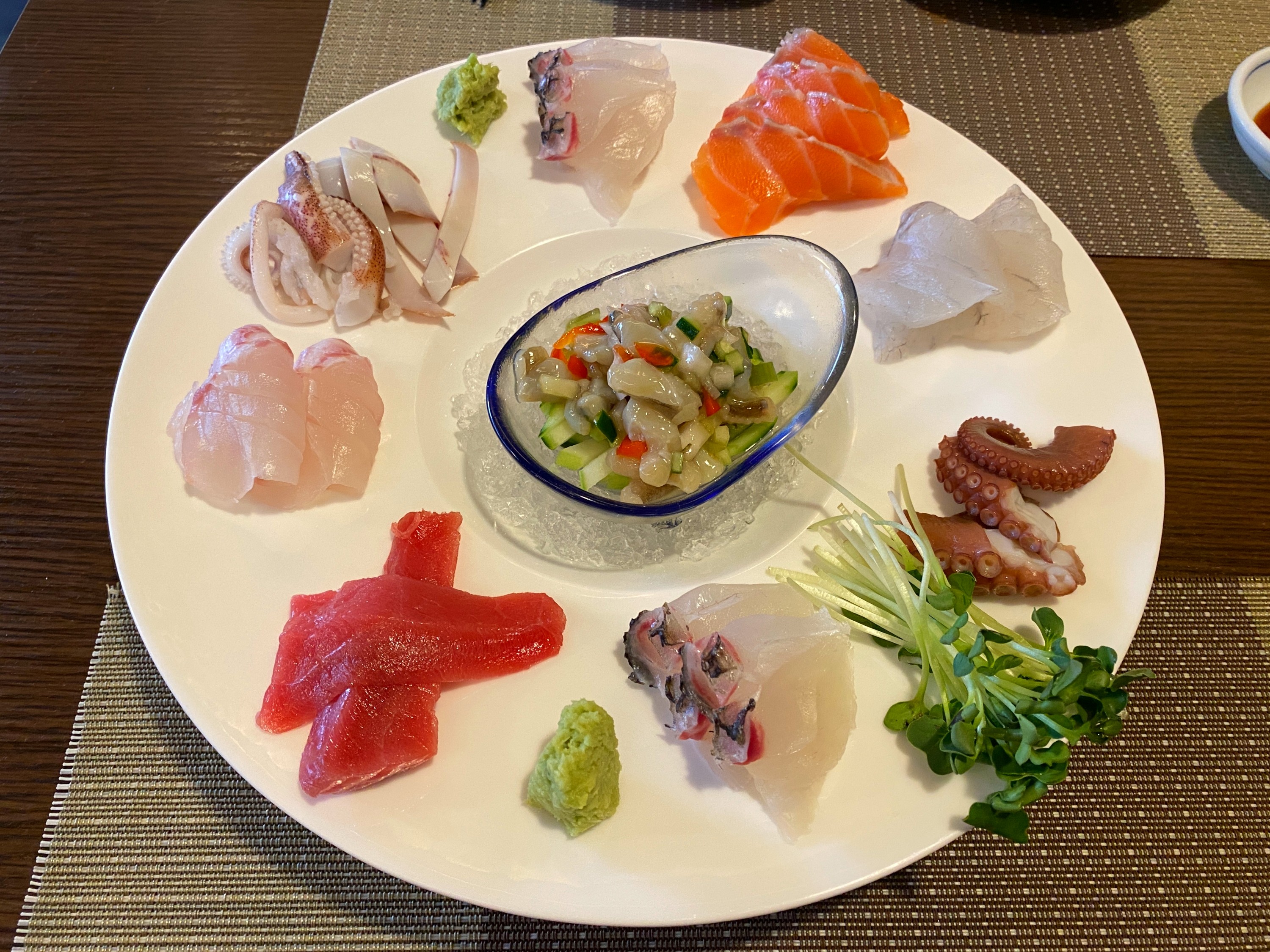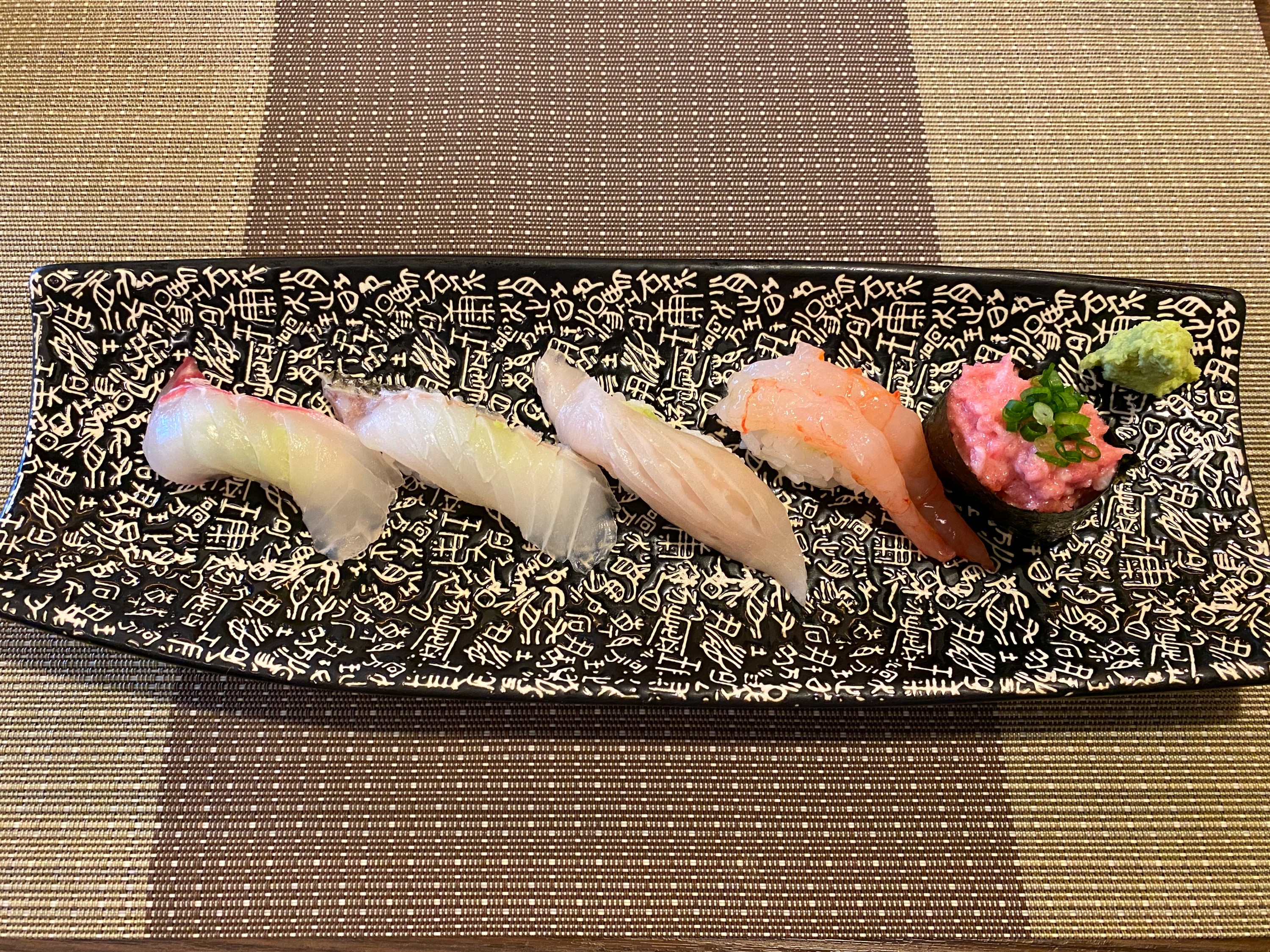 광어, 한치, 도미이고 가운데는 타코와사비이다.