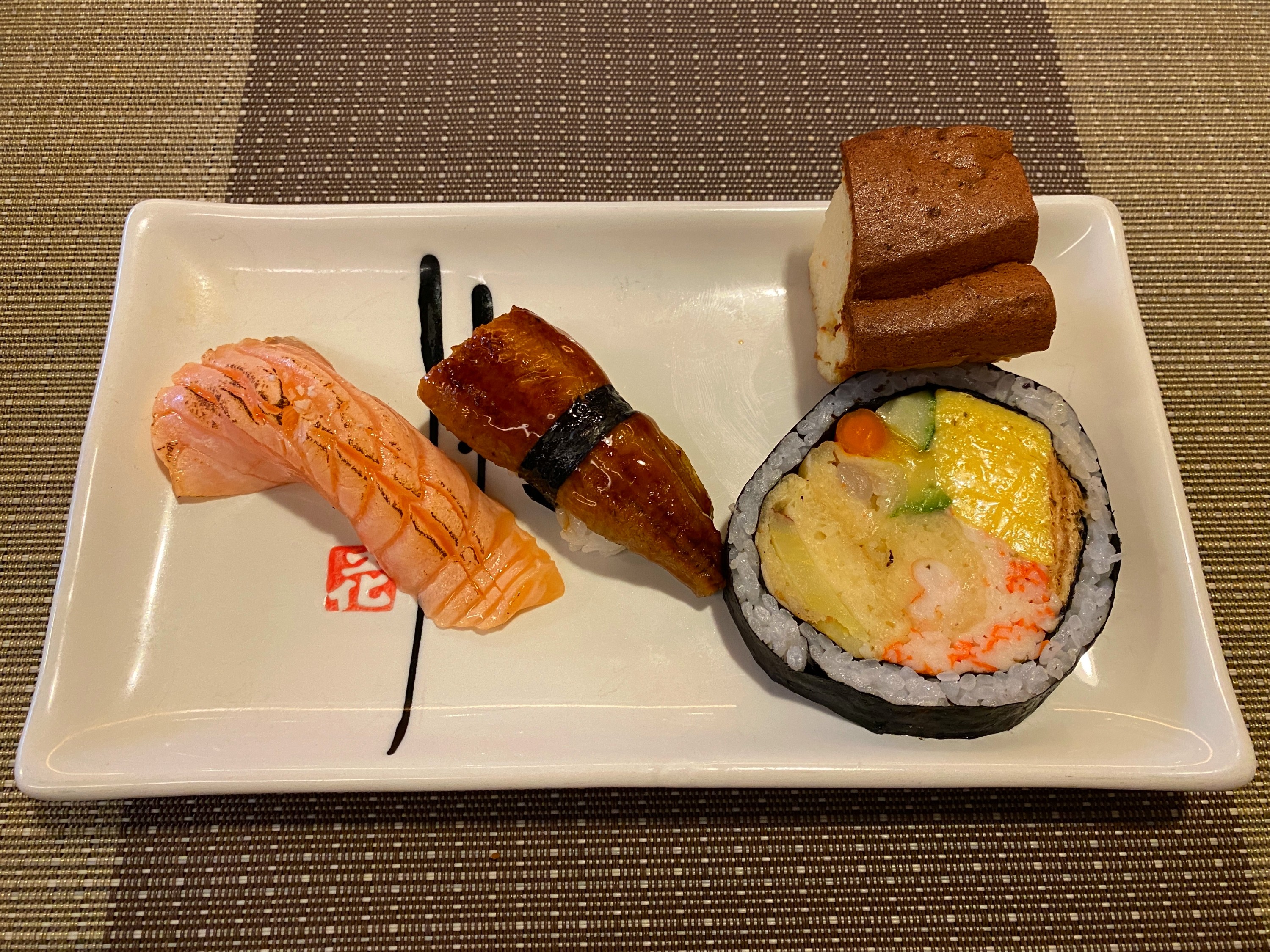 왼쪽부터 연어아부리, 장어, 후토마끼, 카스테라이다.
