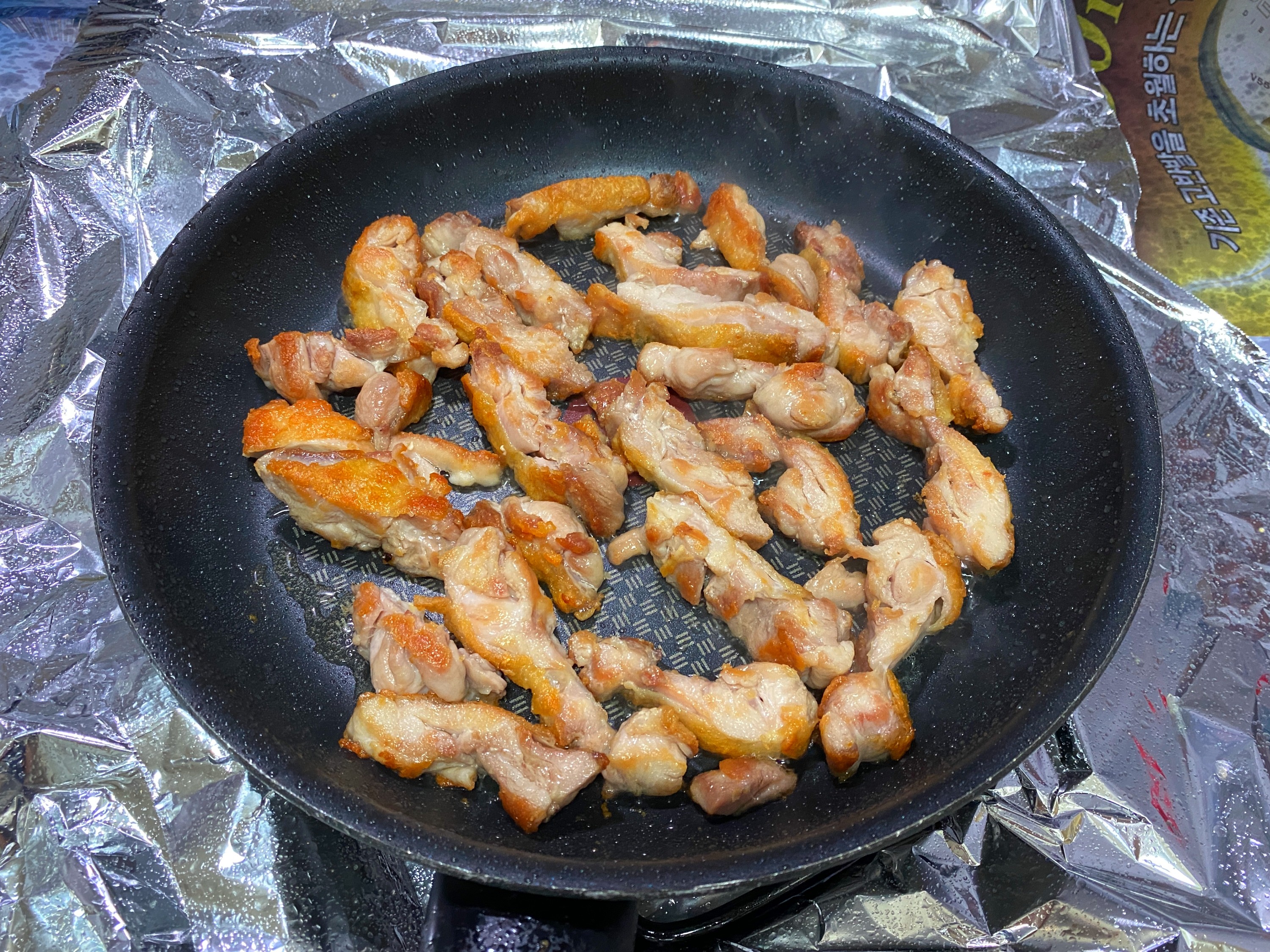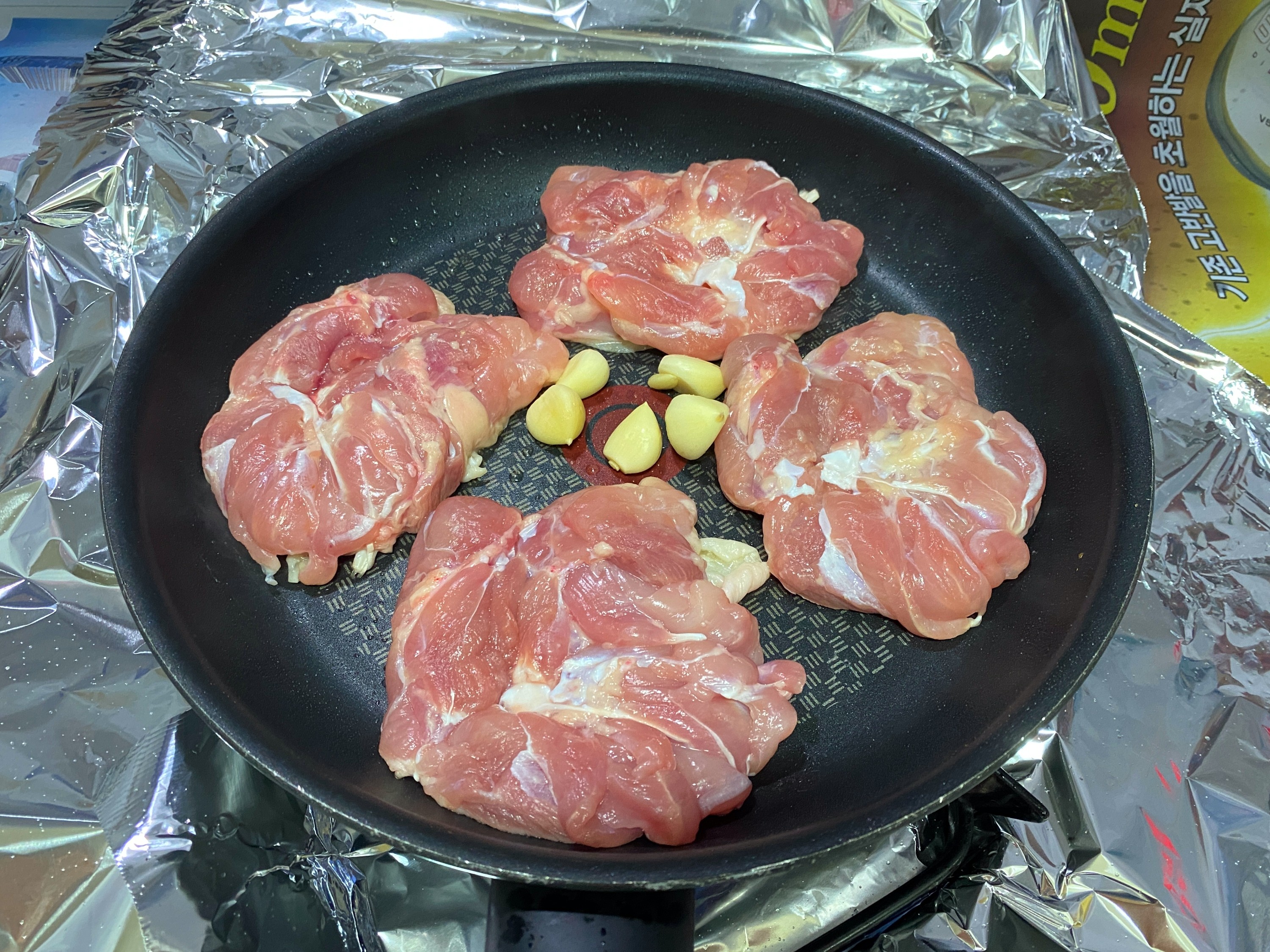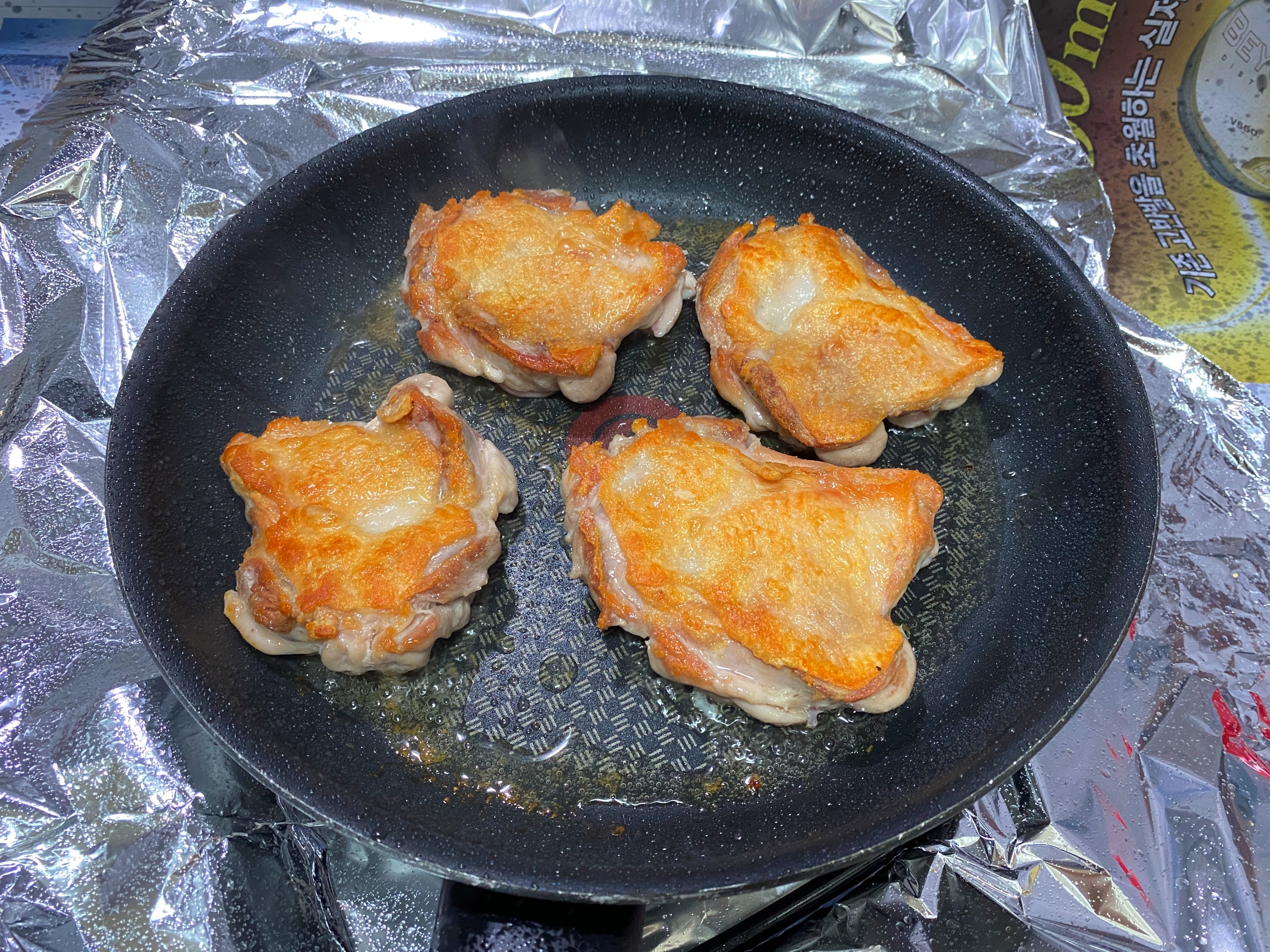 2. 달궈진 후라이팬에 닭다리살과