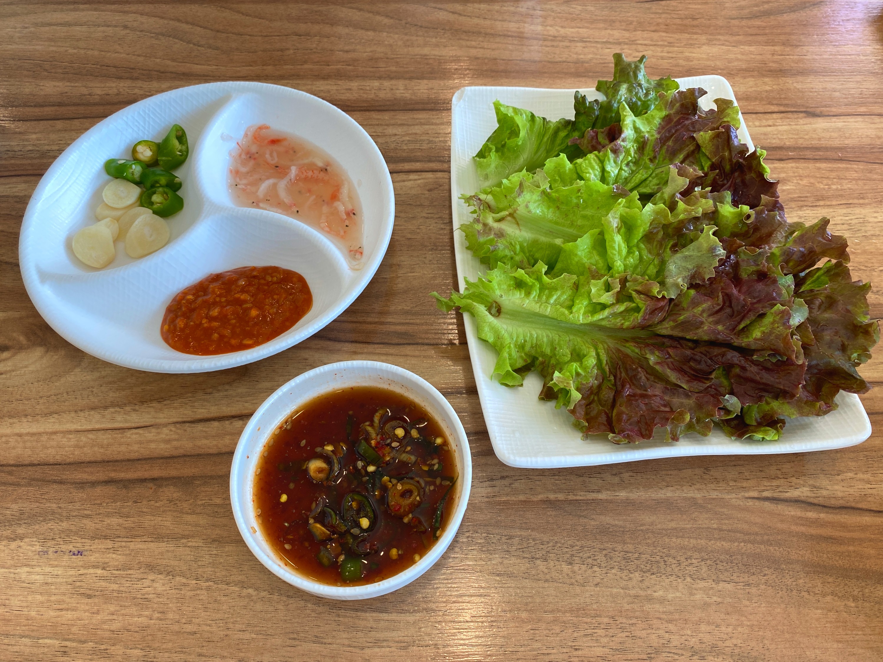 새우젓, 쌈장, 쌈채소와 간장이다.