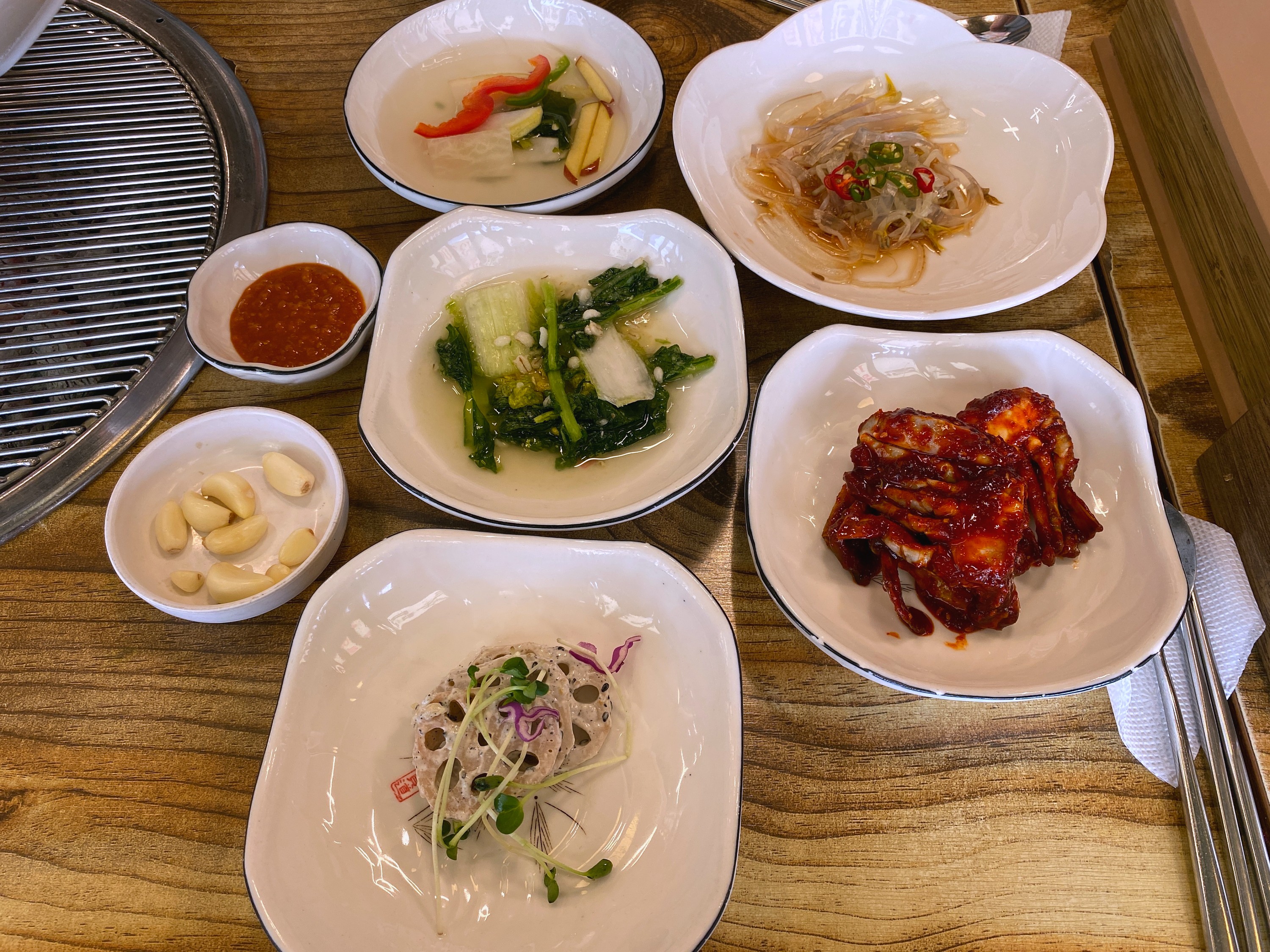 열무김치, 연근샐러드, 마늘+쌈장도 있다.