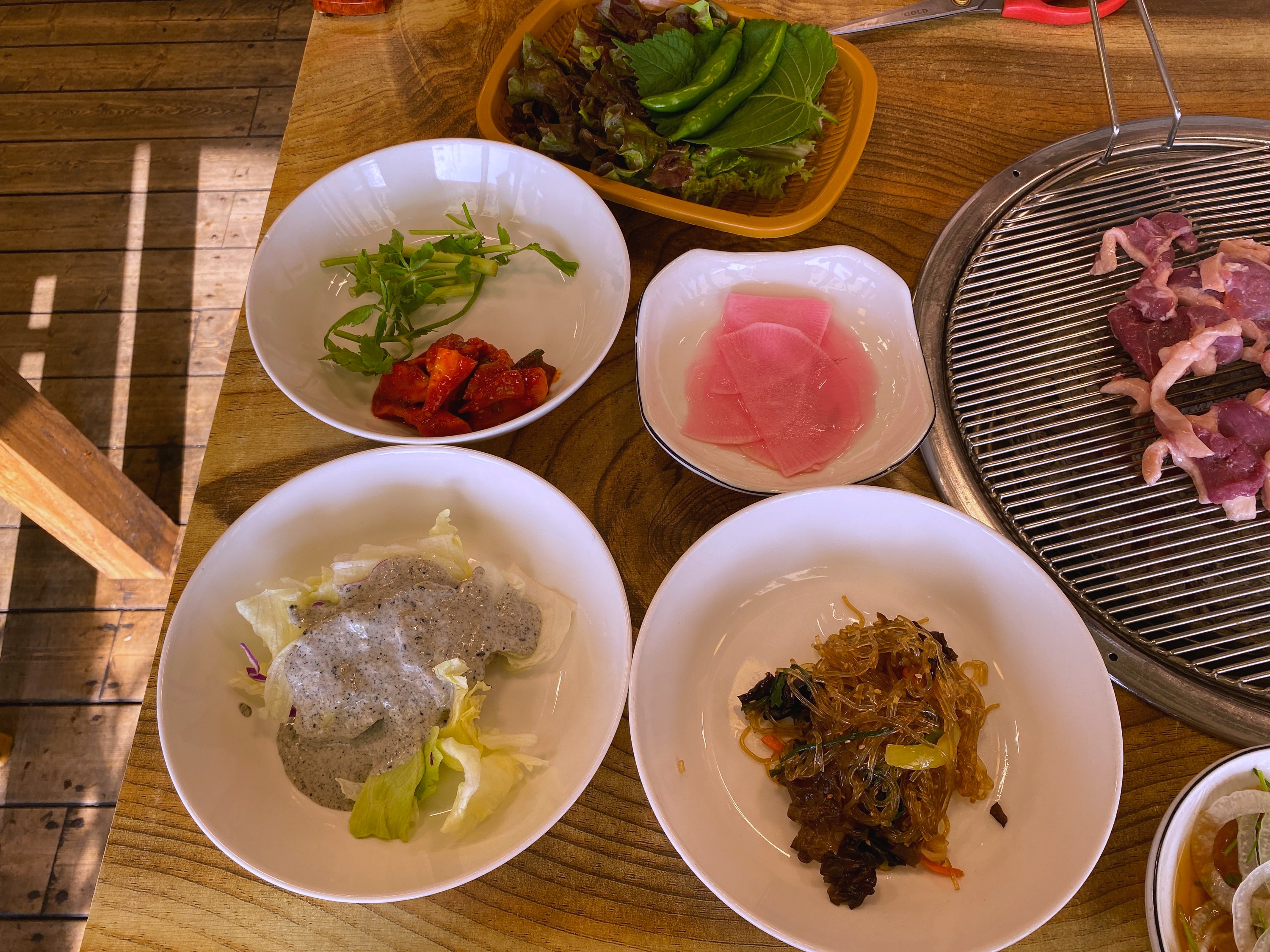 쌈무, 샐러드, 잡채가 나왔다.