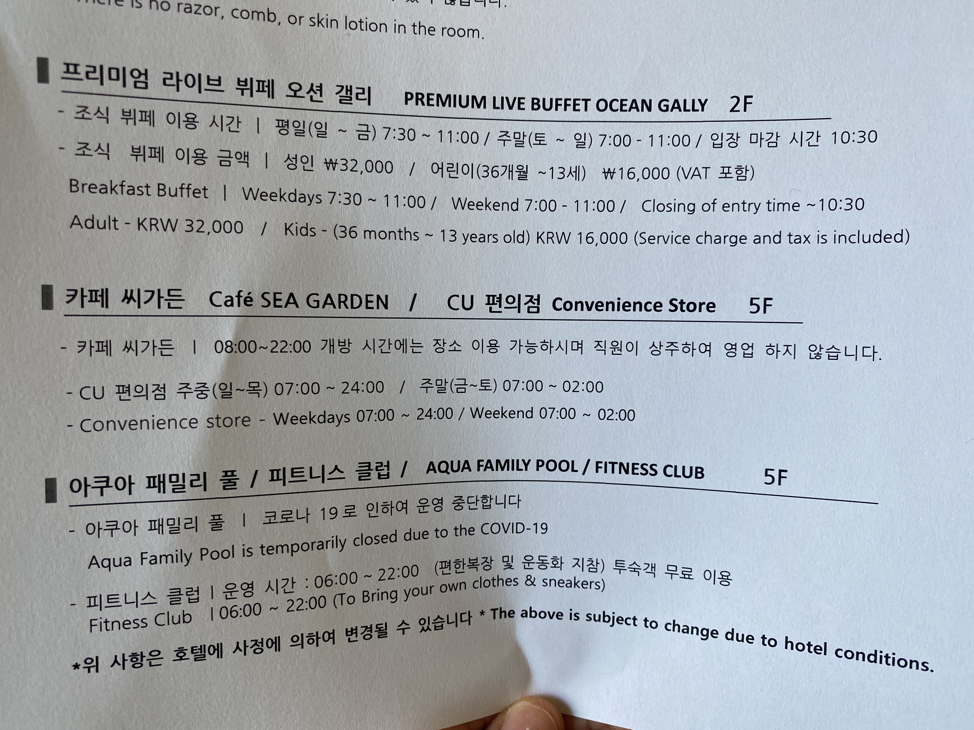 뷔페, 카페, 편의점, 수영장, 헬스장 정보이다.