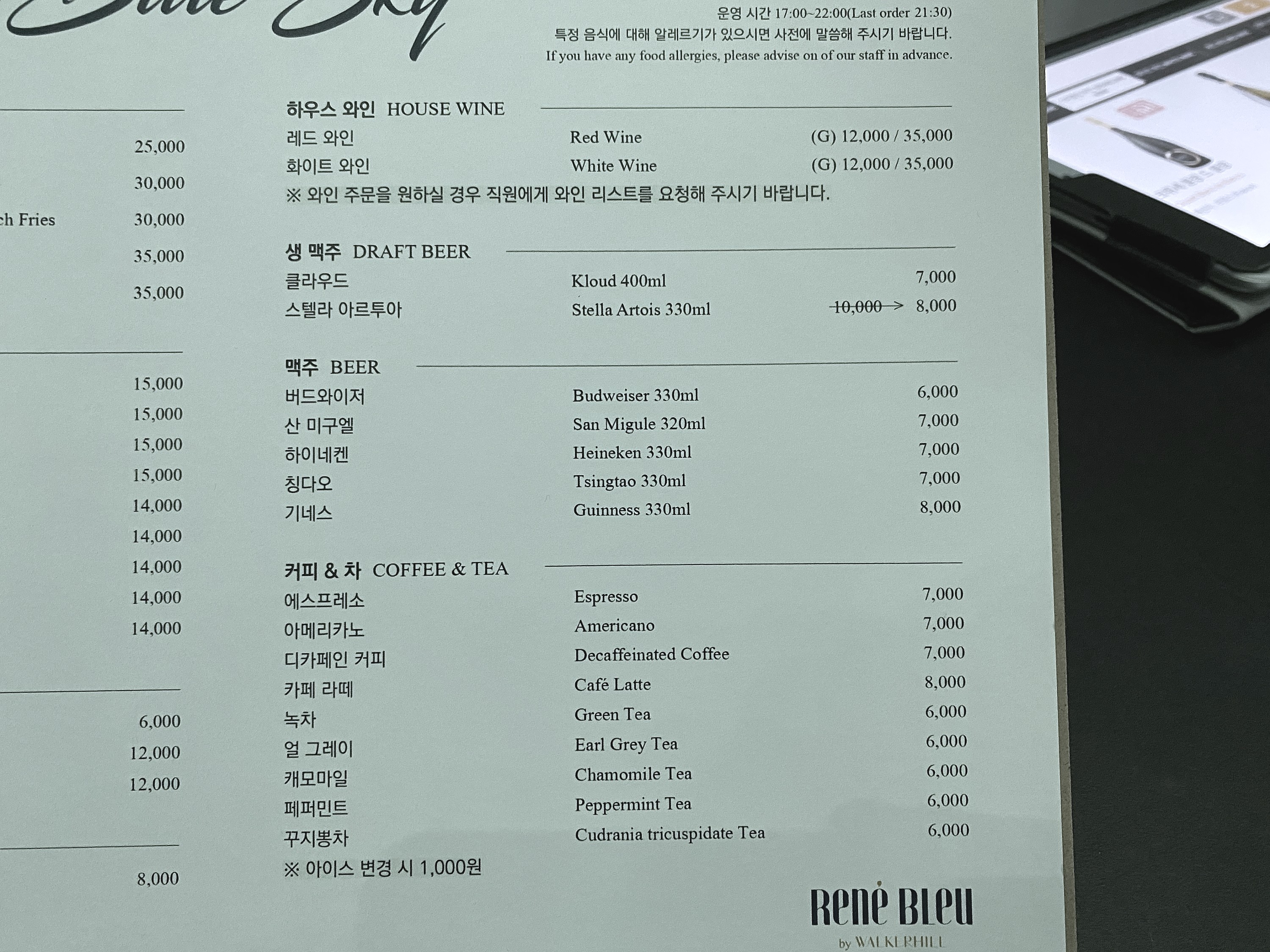 호텔 주변에 정말 아무것도 없어서 저녁을 해결하기 위해 방문한 블루키친이다. 블루키친 내부는 이렇게 생겼고 운영시간은 이러하다. 조식 뷔페도 이곳에서 운영하나보다. 창가자리로 예약을