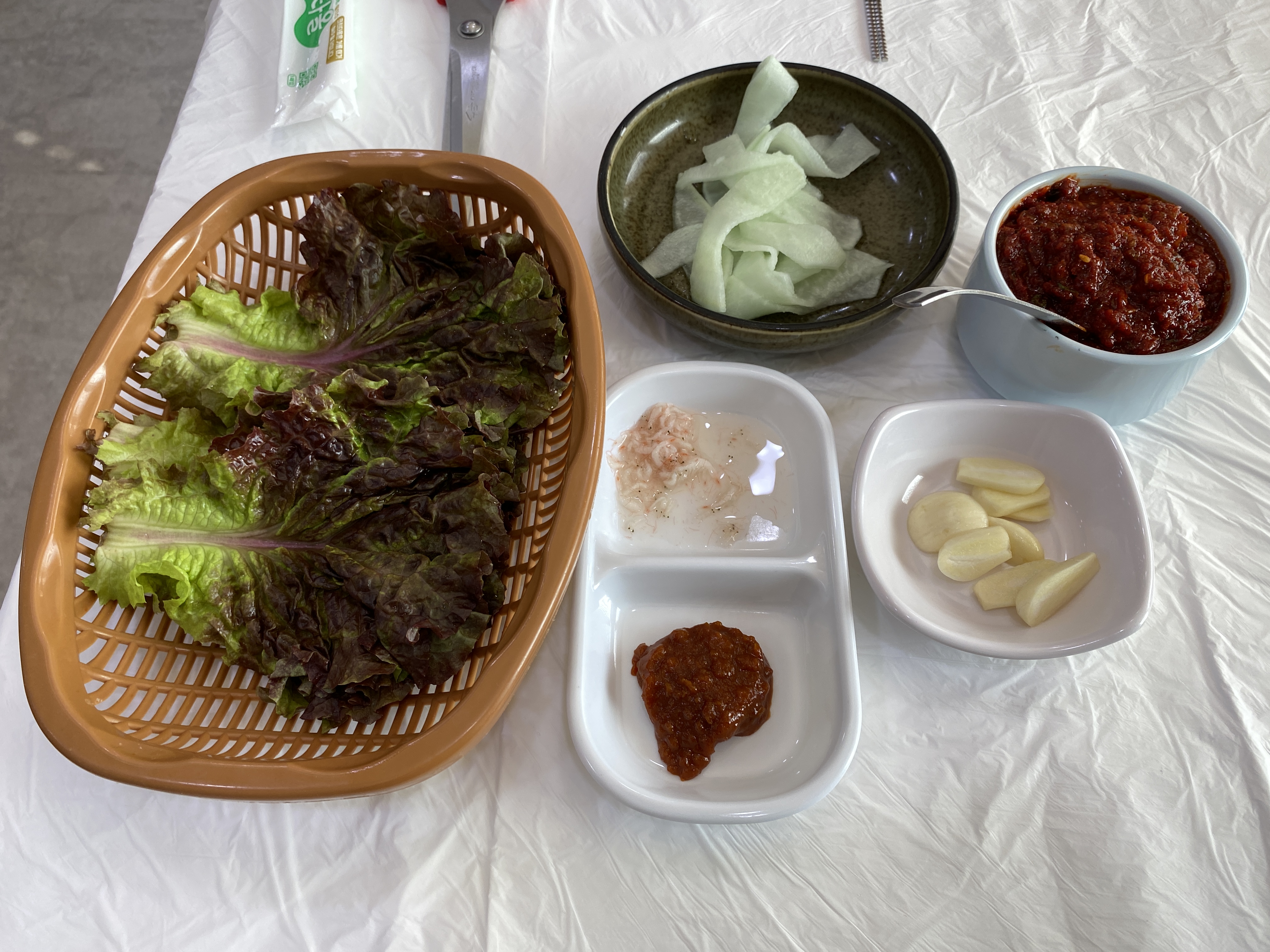 상추, 새우젓, 쌈장, 마늘은 수육을 시켜서 나온 것 같다.