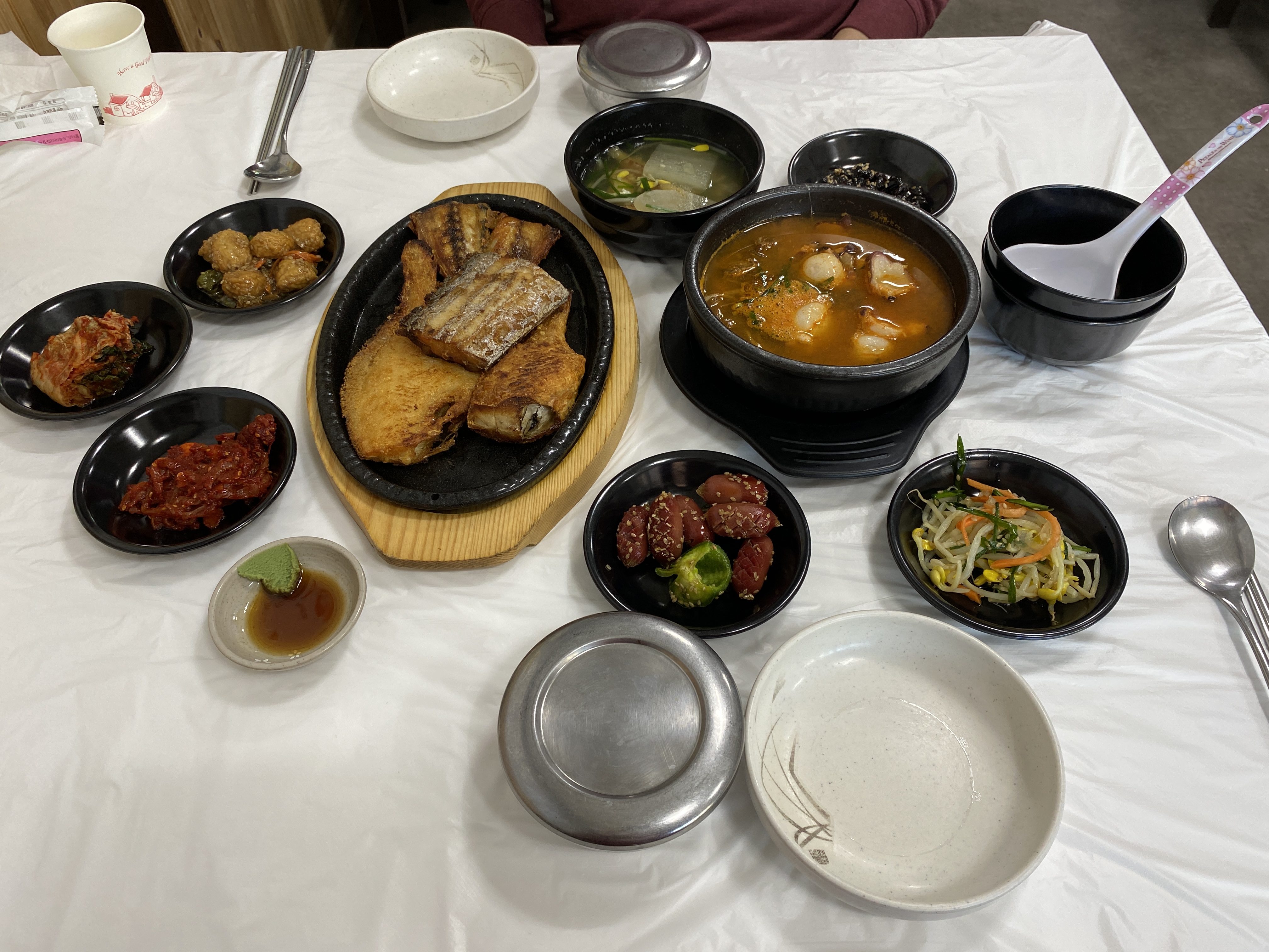 밑반찬은 김치와 어묵조림, 오징어젓갈,