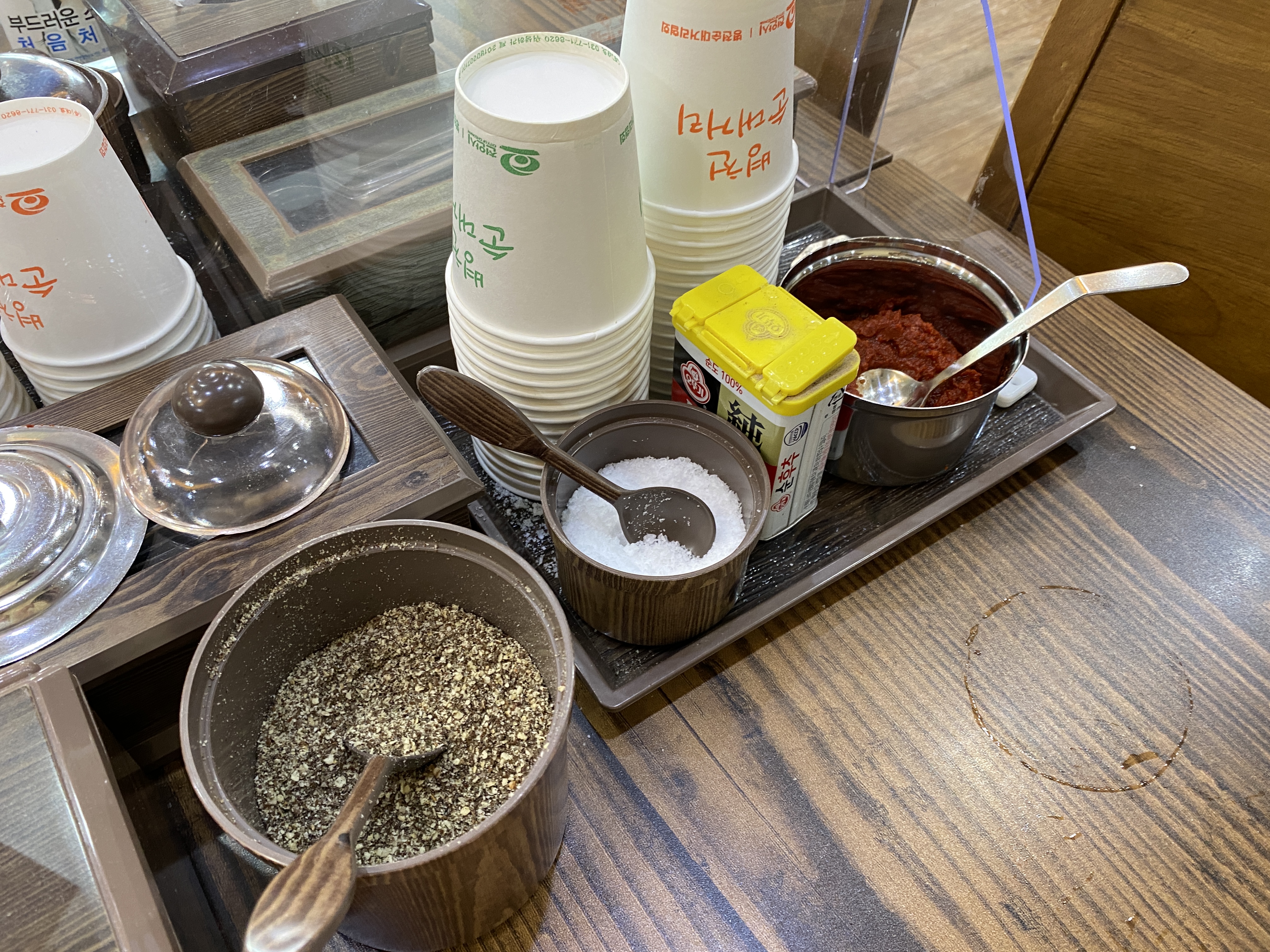 테이블 한켠에는 들깨가루, 소금, 후추,