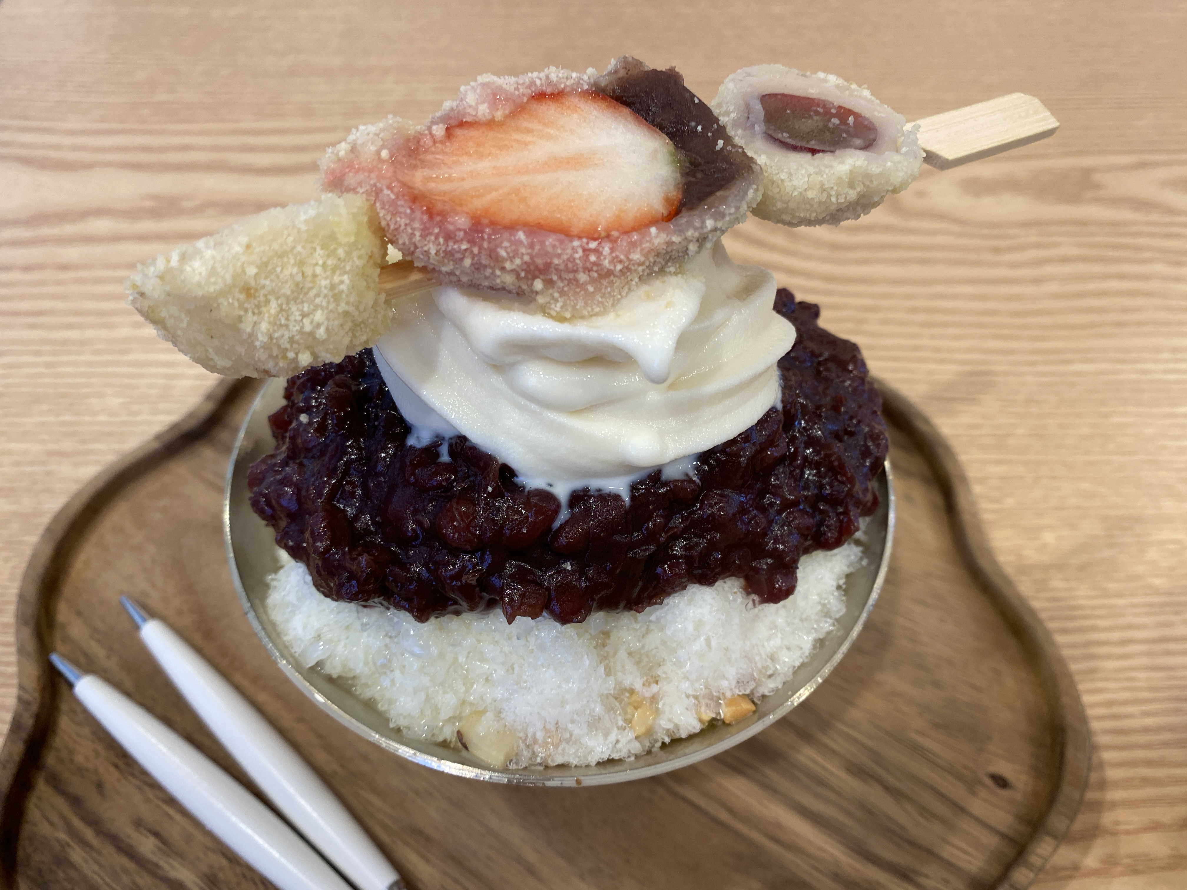 빙수 위에 반쪽짜리 당고가 얹어져있다.