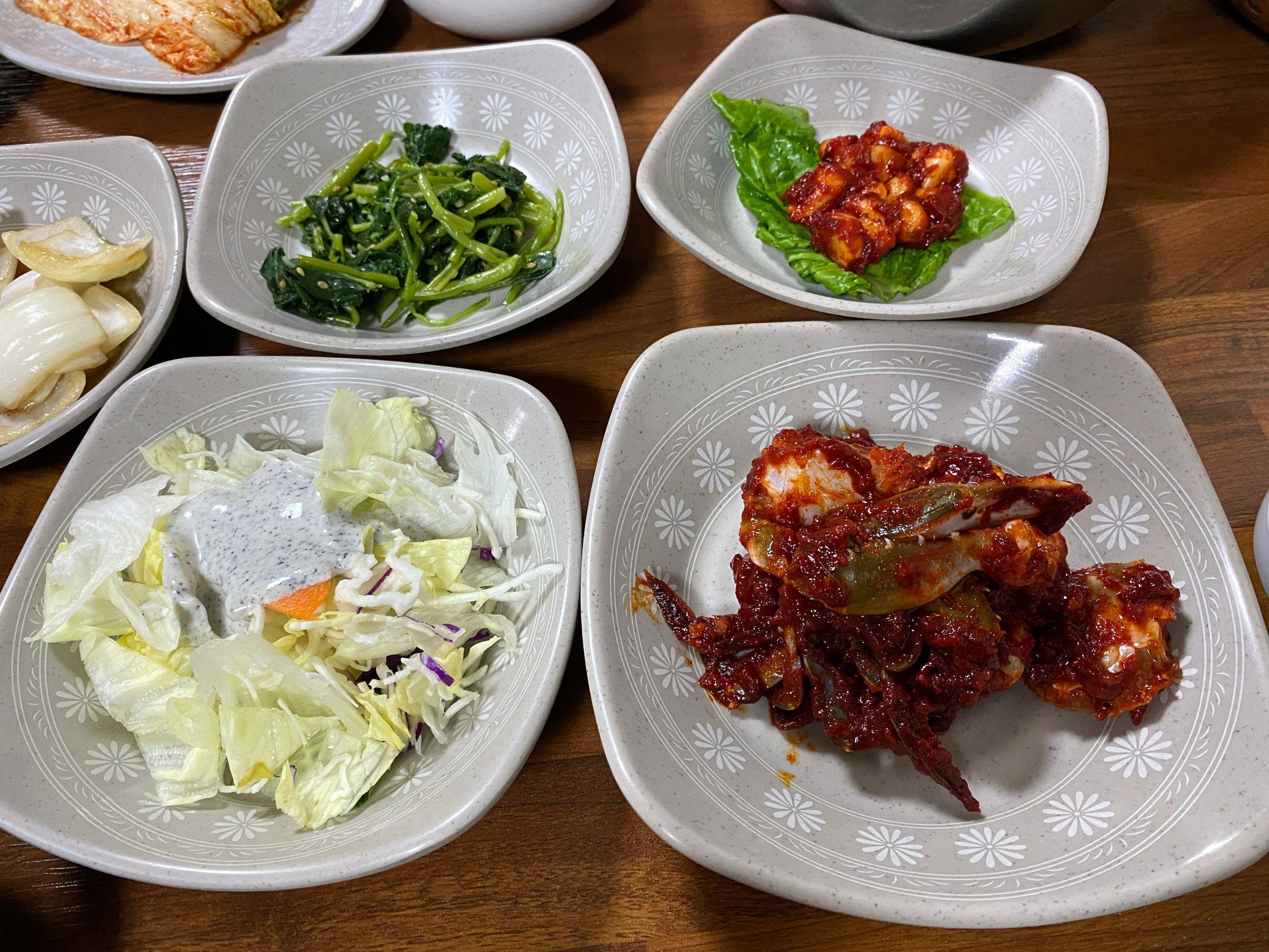 밑반찬으로는 나물, 마늘장아찌무침, 샐러드, 양념게장