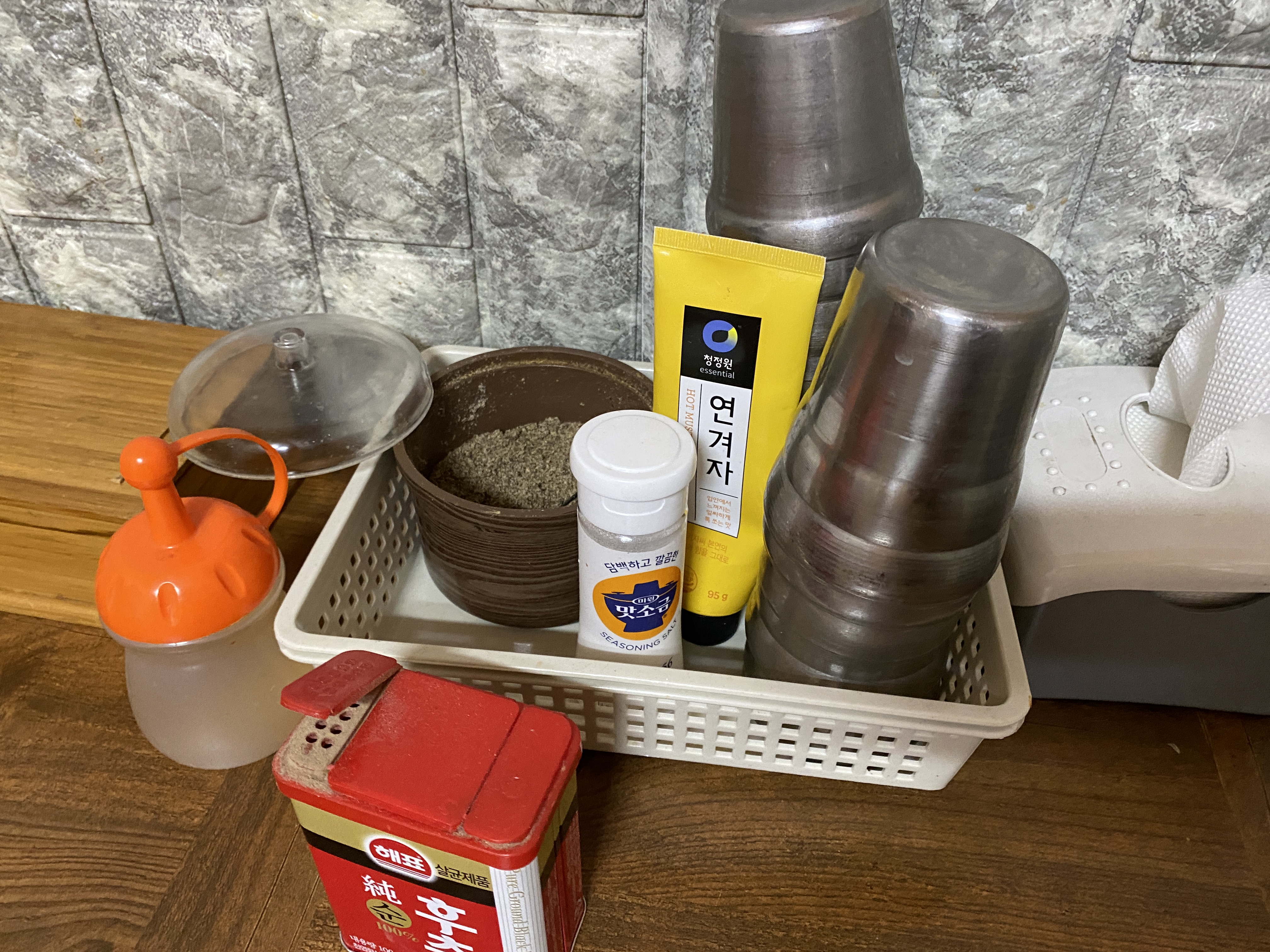 후추, 맛소금, 연겨자가 놓여있고