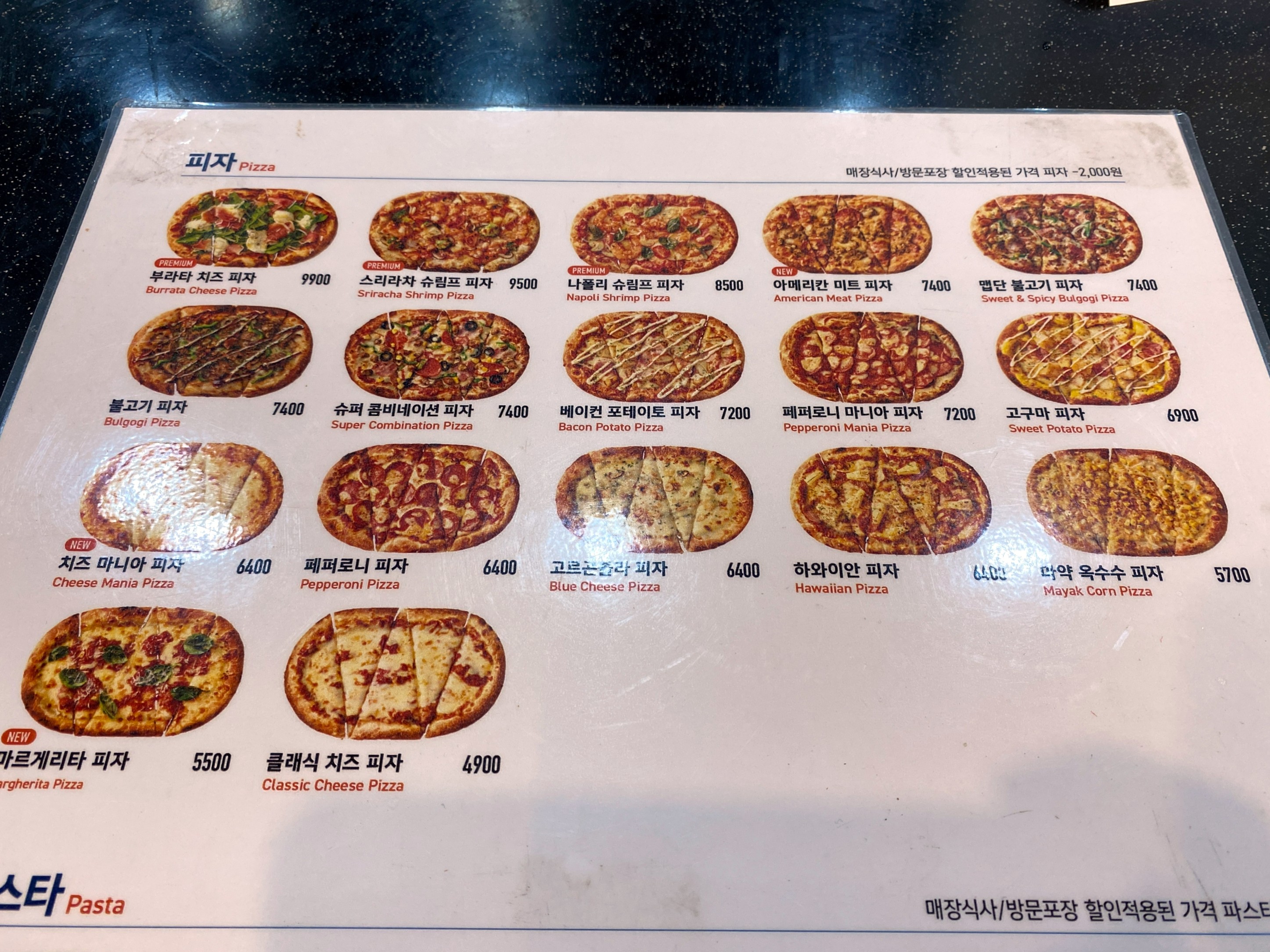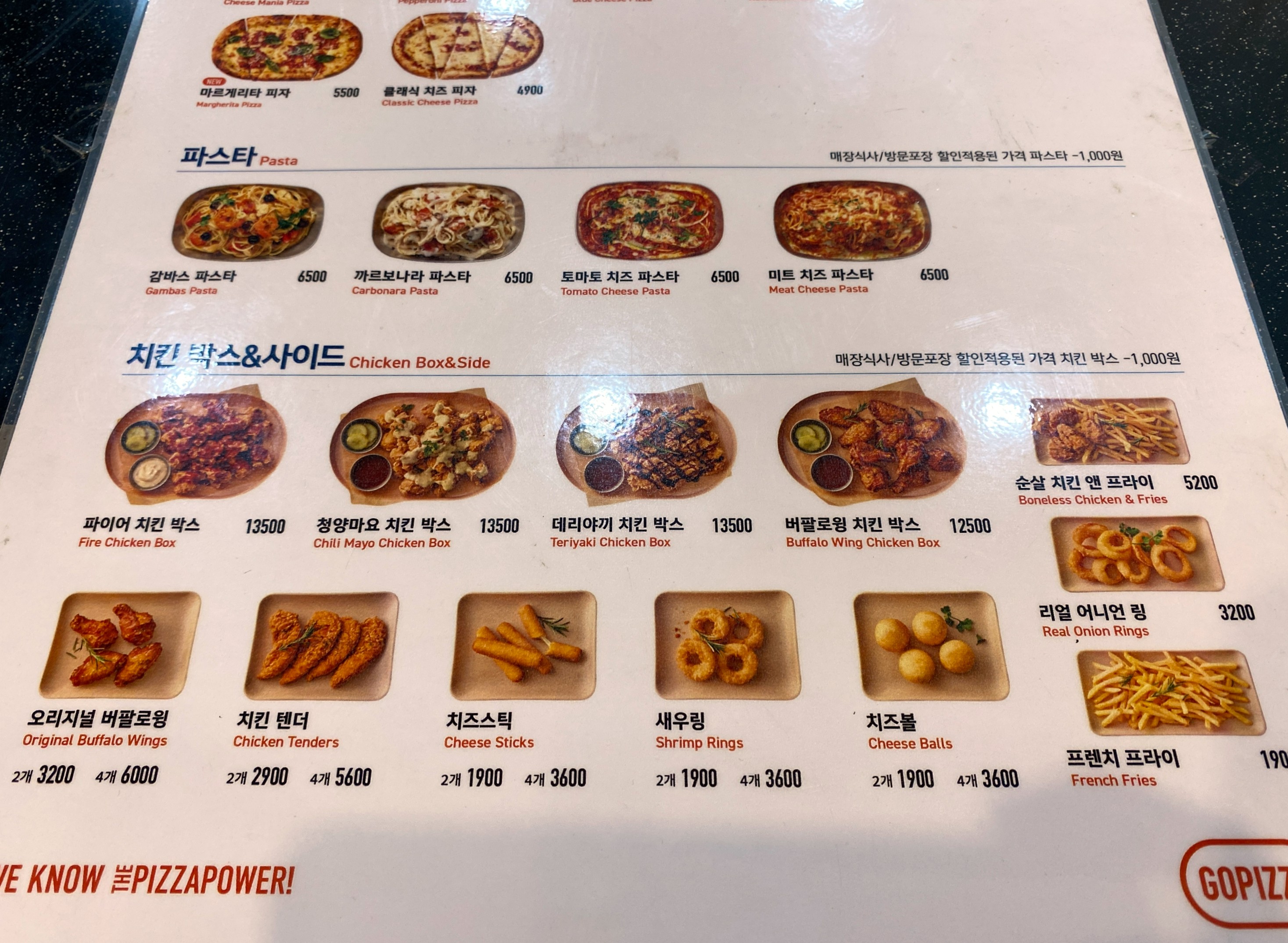 피자는 2천원이, 파스타와 치킨박스는