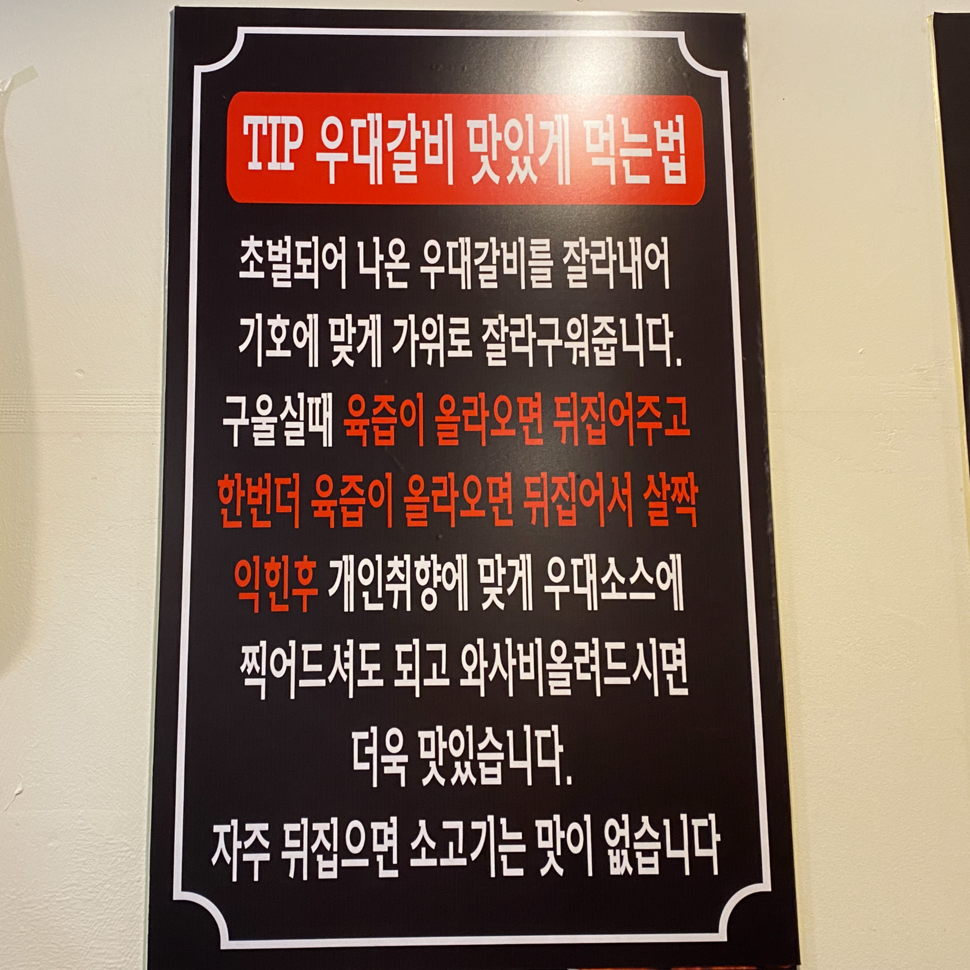 구워주는 직원을 잘 만나야하는 "동타안' 동탄1에 차수리를 하러 갔다가 도보거리의 우대갈비집을 발견했다. 이곳의 영업시간은 이러하고 가게내부는 이러하다. 이곳의 메뉴판이다. 우리는 우