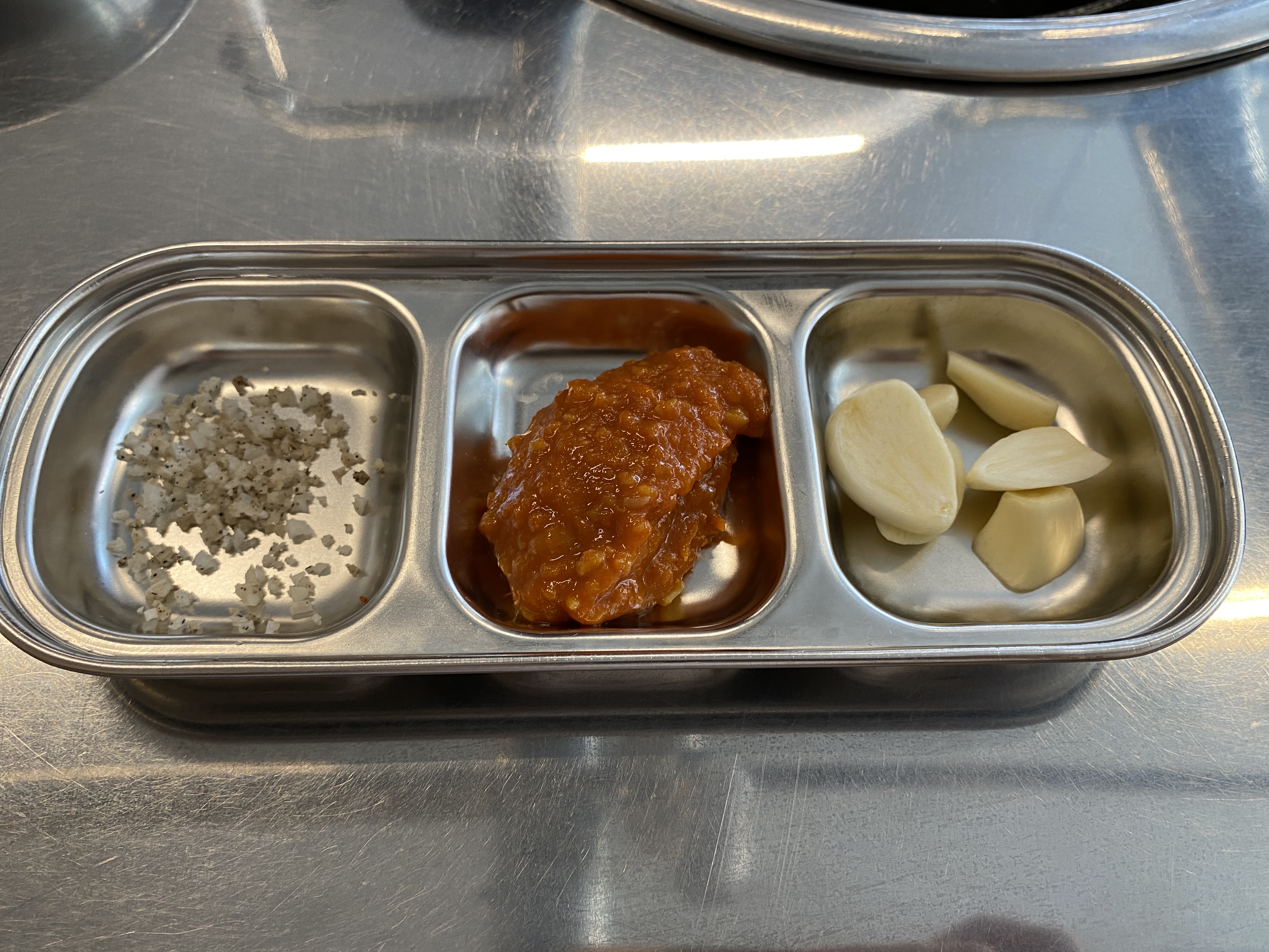 멜젓이랑 소금, 쌈장, 마늘도 있다.