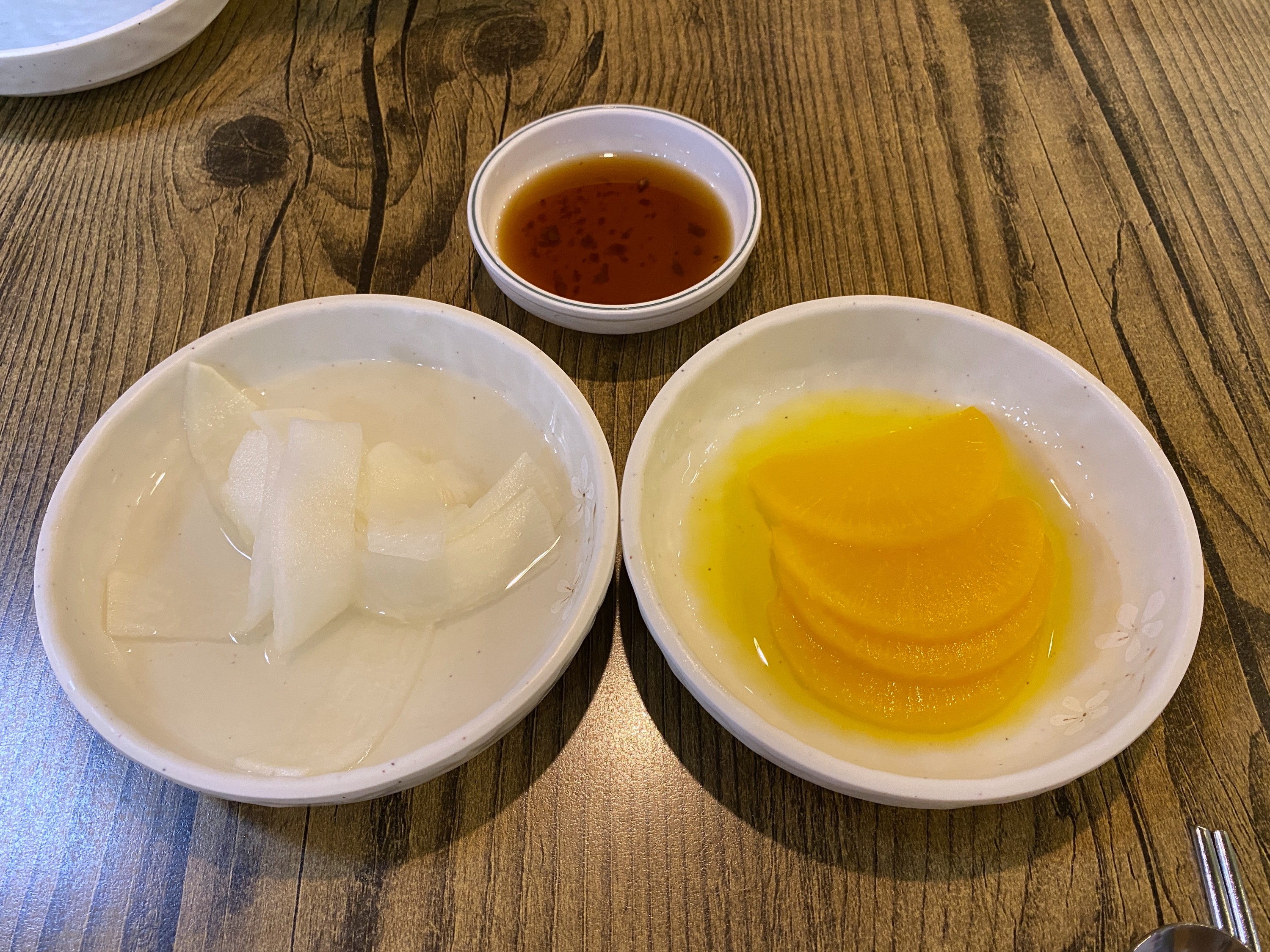 무절임과 단무지, 만두용 간장이 나왔다.