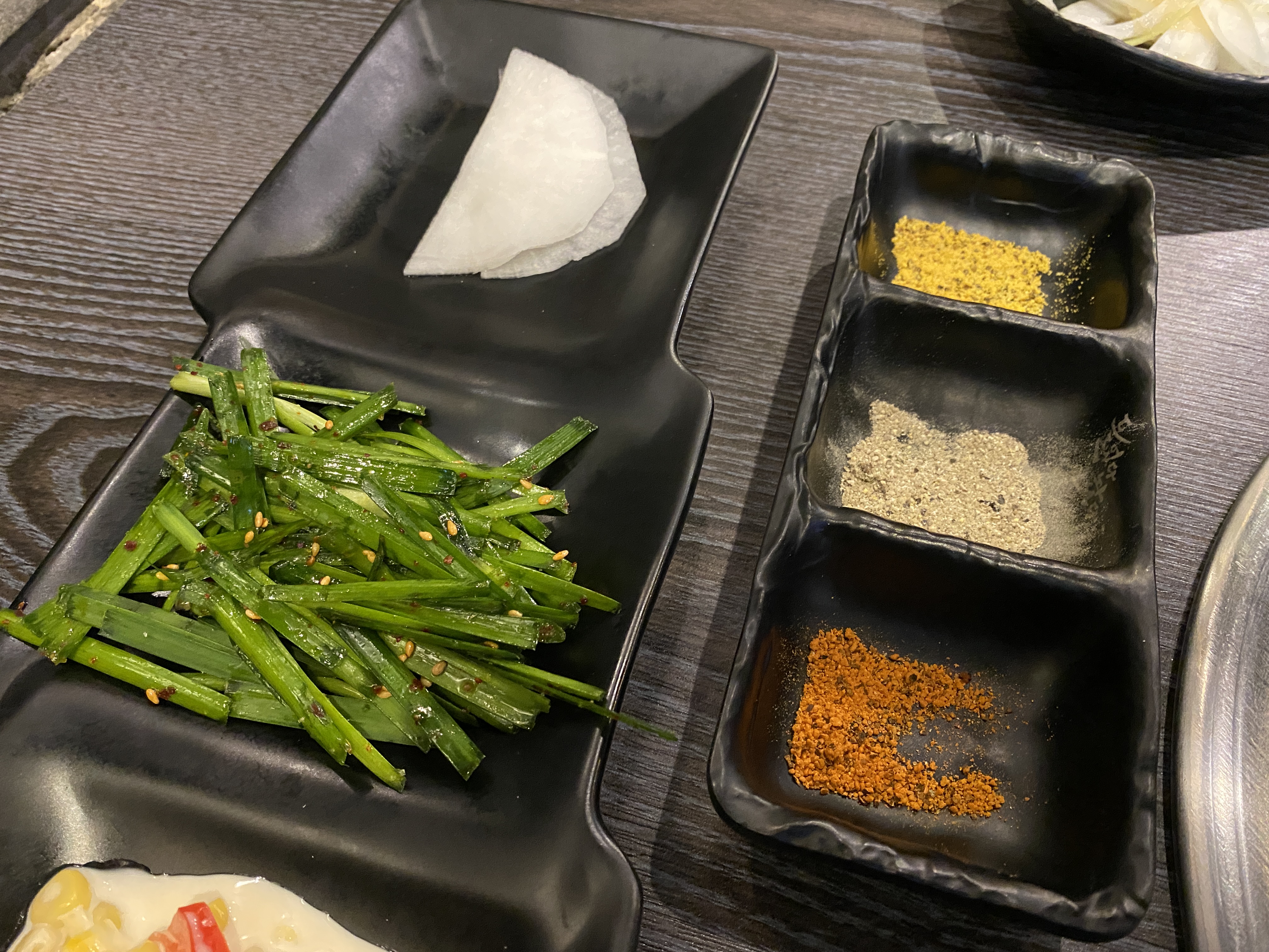 밑반찬으로는 쌈무, 부추무침, 콘샐러드가 있고