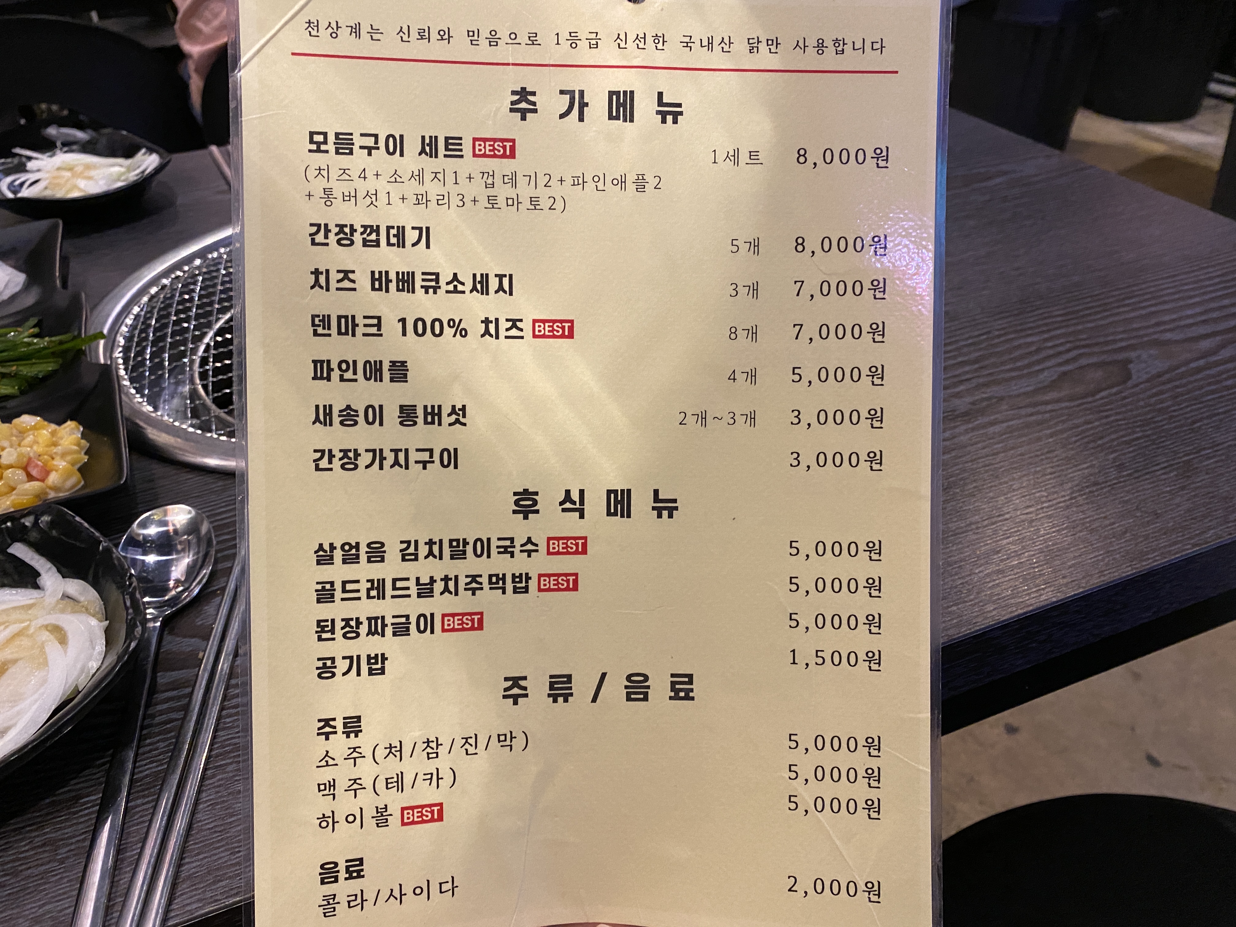 완전 별미였던 "천상계" 동탄호수공원에 새로 오픈한 닭특수부위 전문점이다. 이곳의 영업시간은 오후 5시부터 새벽 1시이고 (라스트오더는 밤12시) 주말 및 공휴일에는 오후 3시부터 새벽 1시이