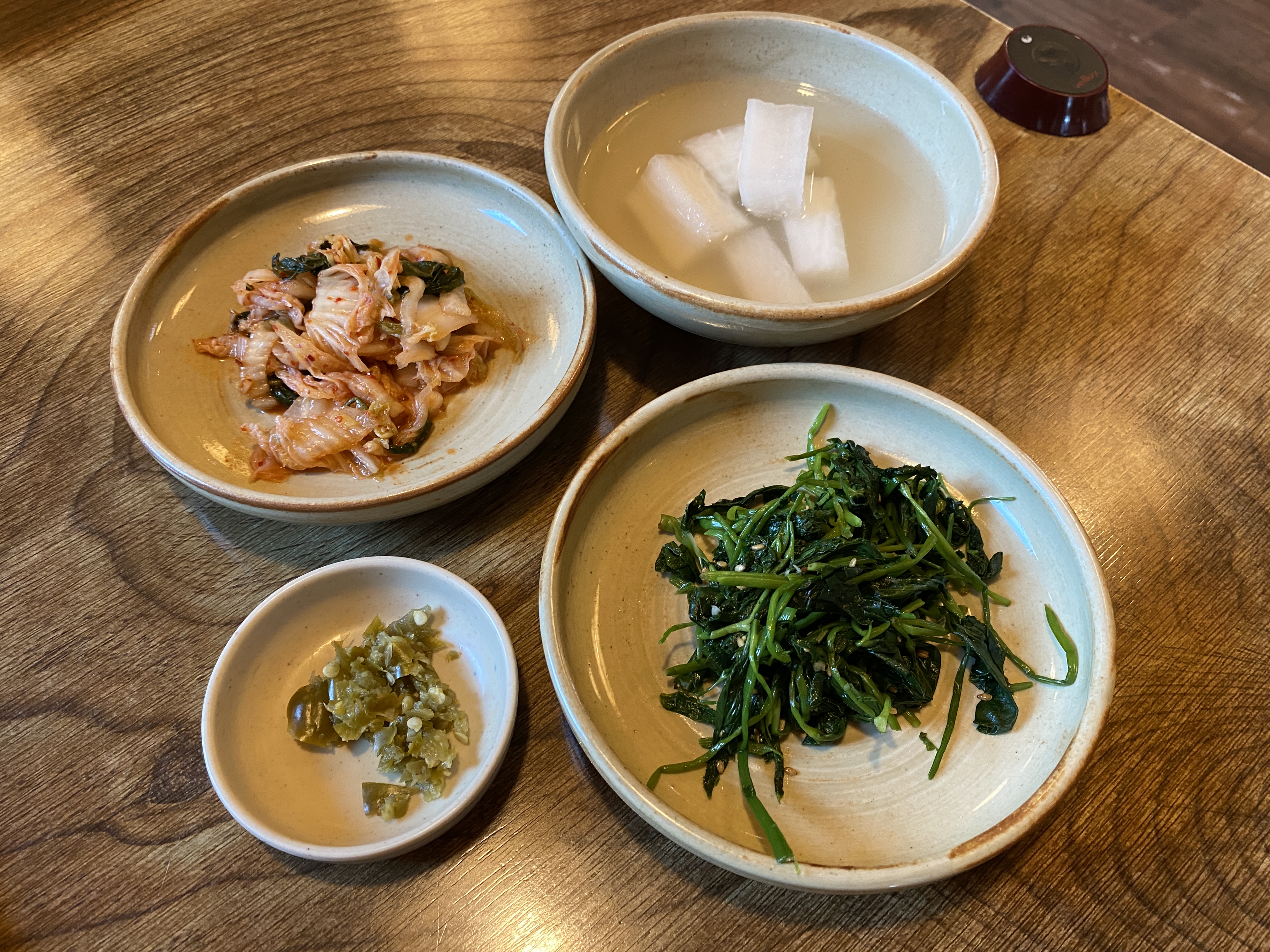 밑반찬은 김치, 동치미, 지고추다짐, 참나물무침이 나왔다.