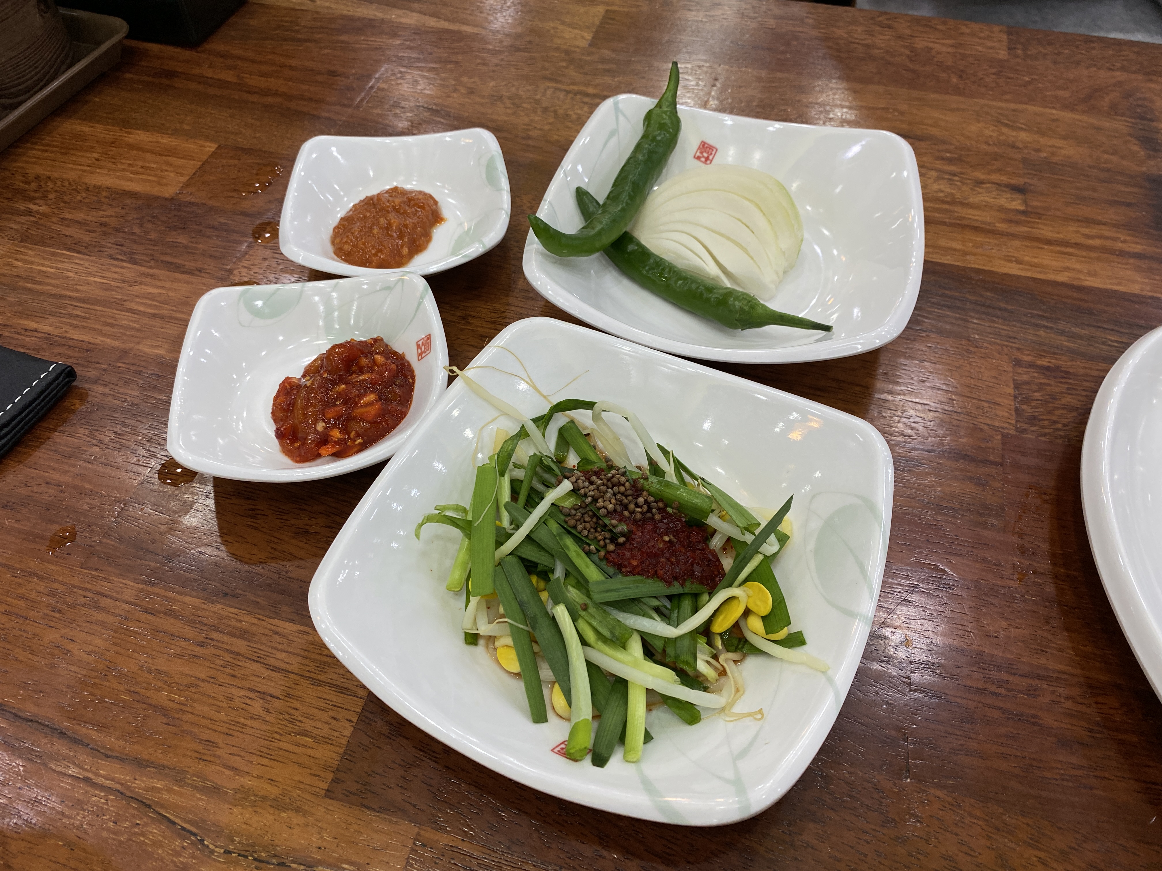 밑반찬으로는 오징어젓, 양파+고추와