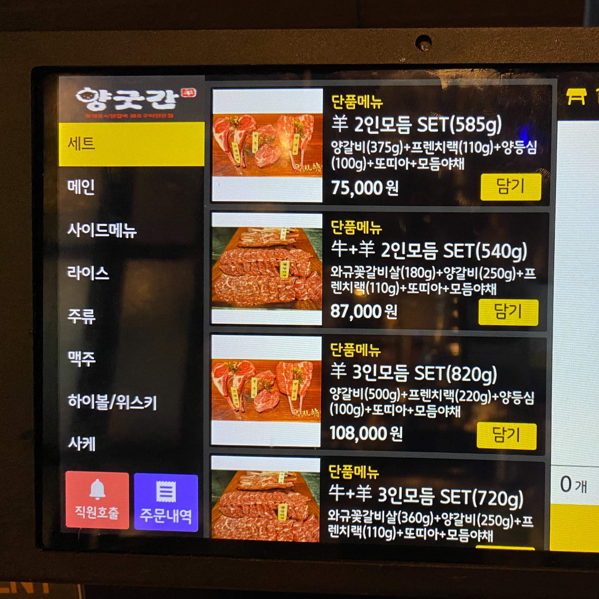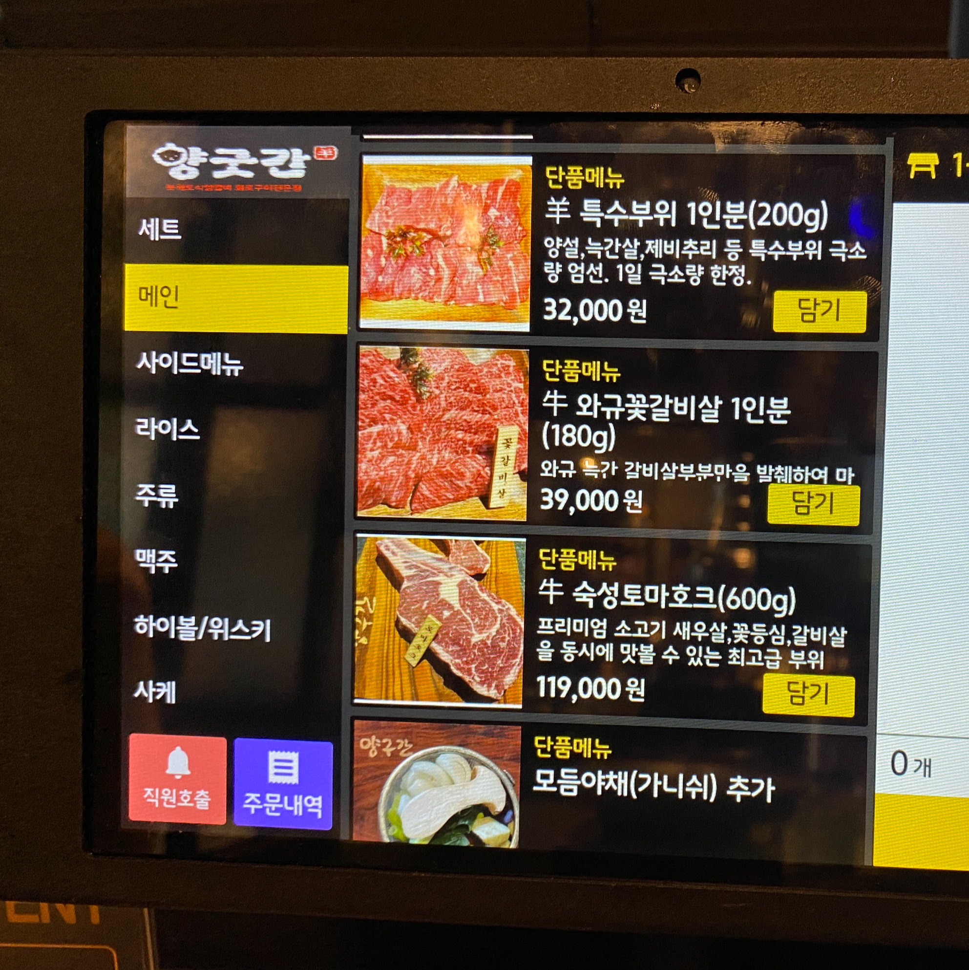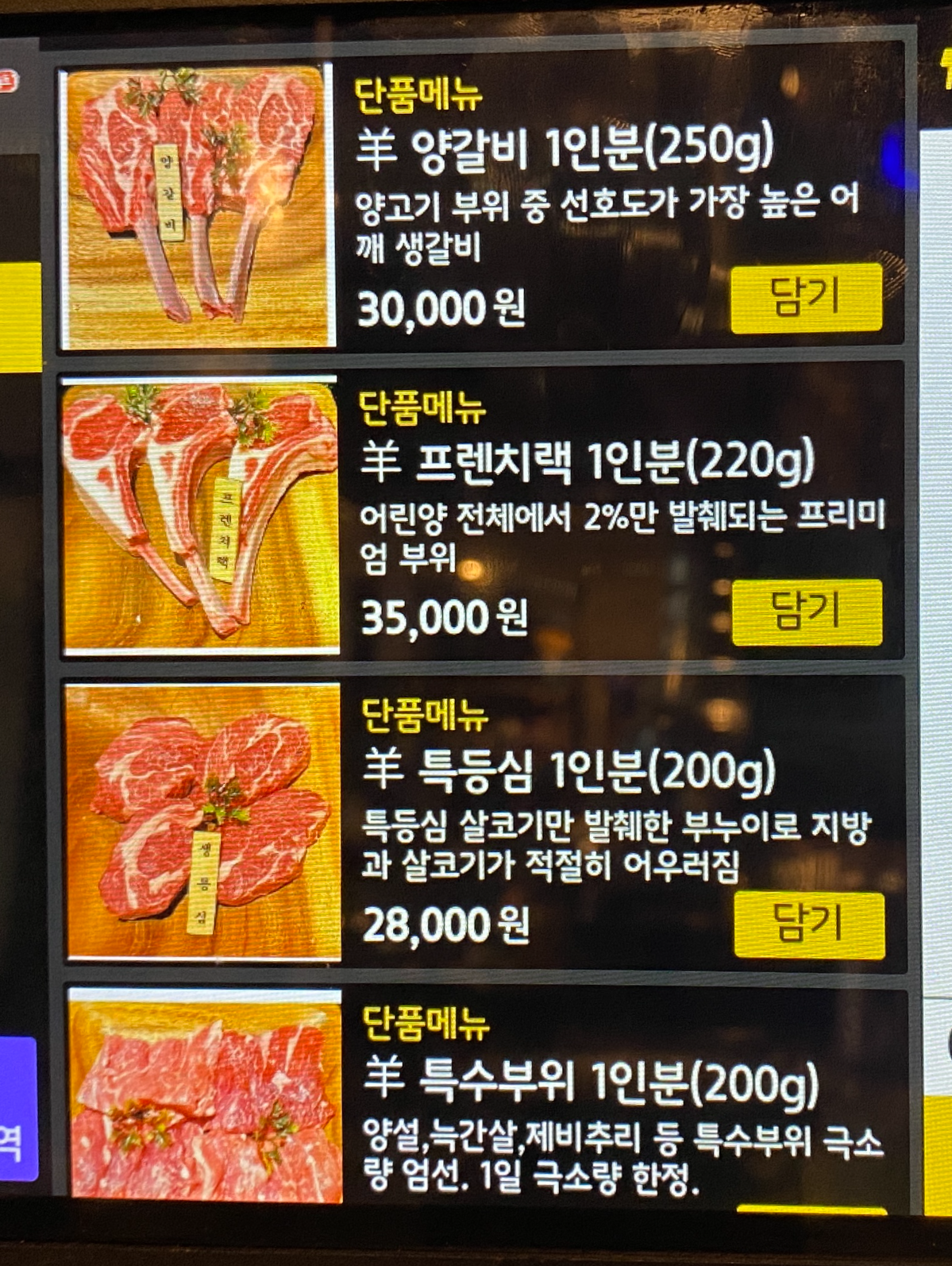 양갈비랑 특등심을 1인분씩 추가로 주문했다.